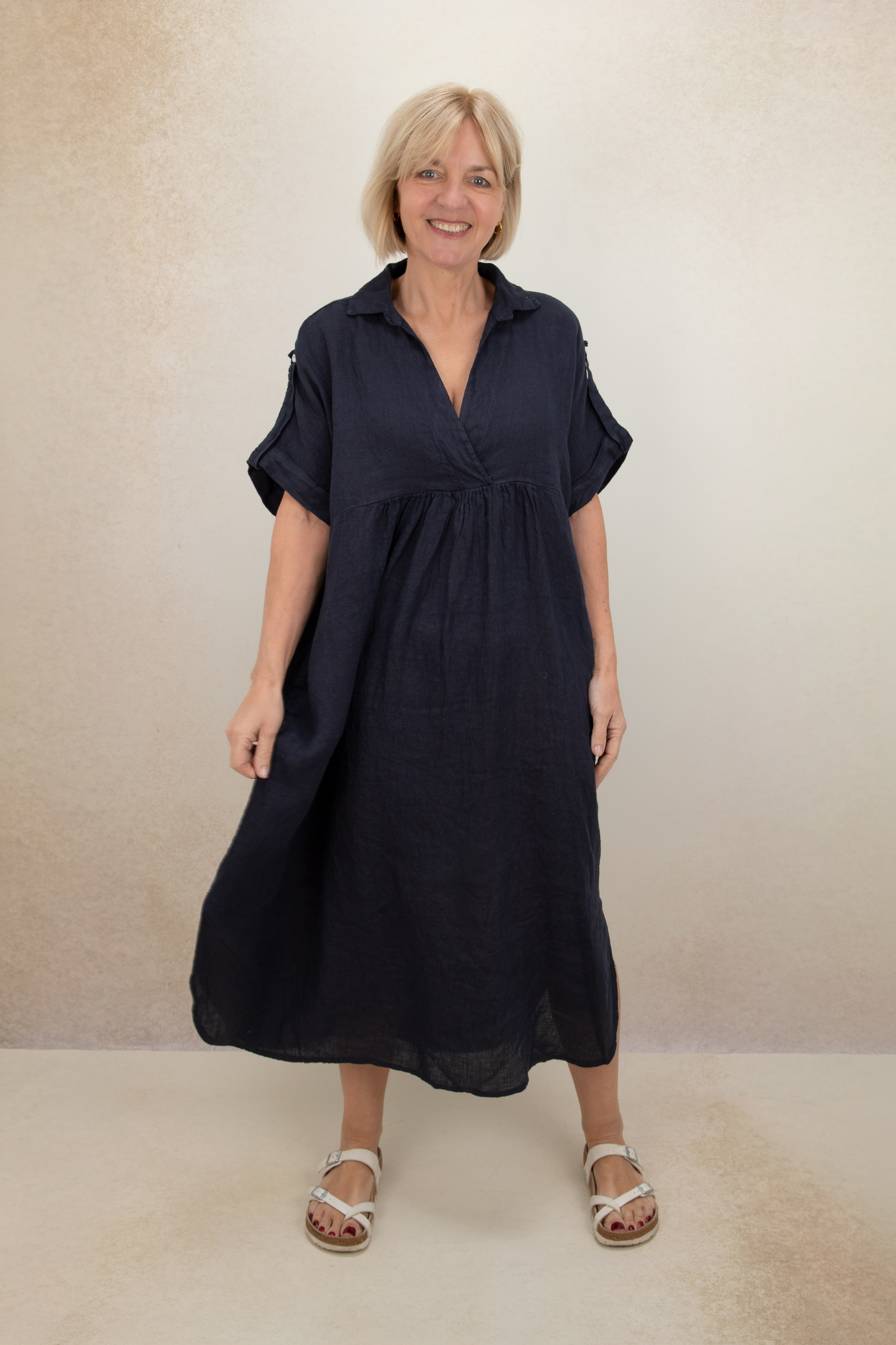 New for 2026, The Camile has an easy, relaxed fit, a flattering midi length, and a softly structured silhouette. Designed with a collared V-neckline, short rolled sleeves, and side pockets, it combines effortless style with everyday practicality. Side splits add movement and comfort, making it ideal for all-day wear. Crafted from 100% breathable linen, it will typically fit UK sizes 8–14. Perfect for warm weather, holidays, or casual days at home, pair with trainers or sandals for an easy, laid-back look.
