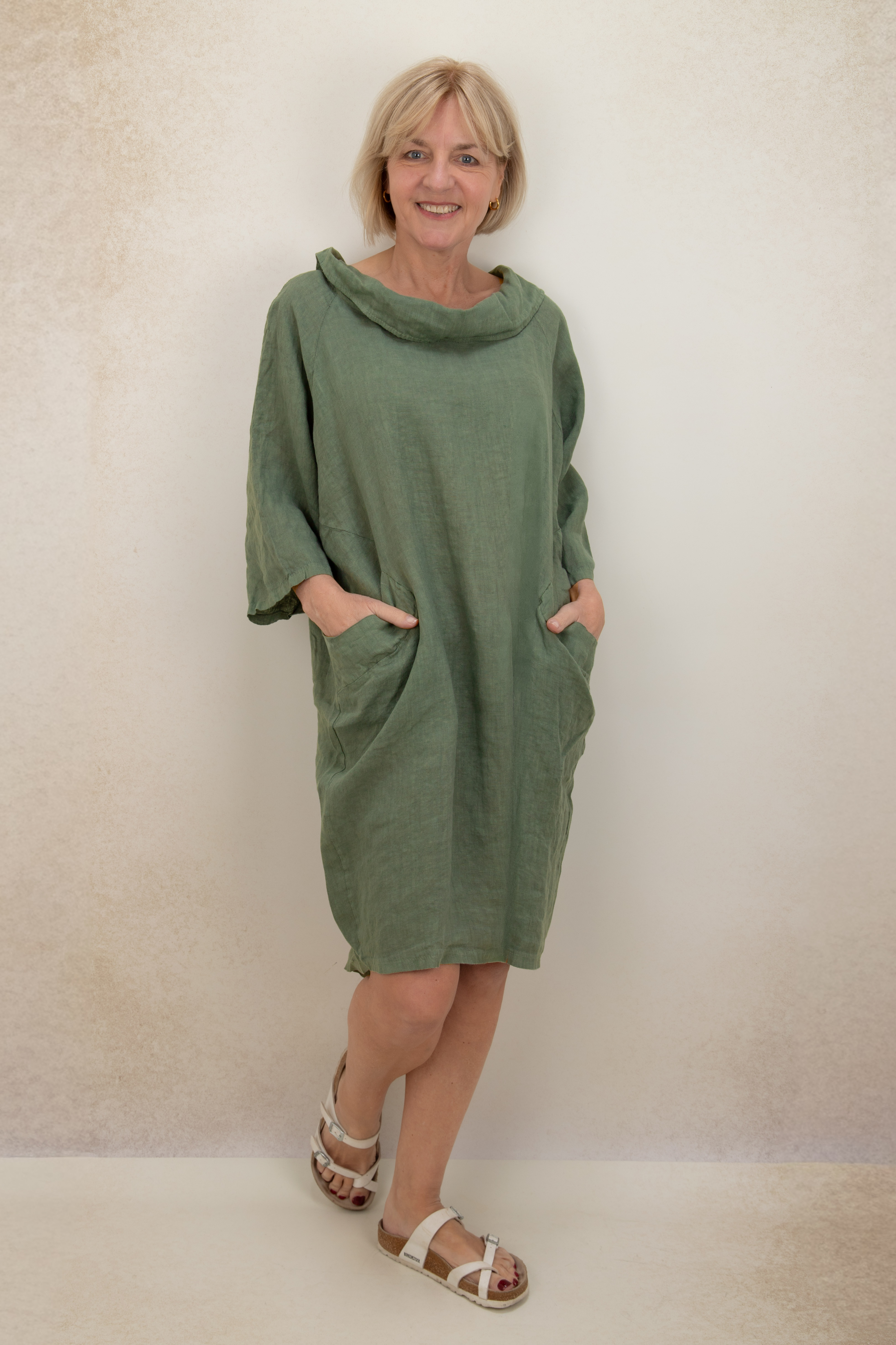 New for 2026, The Celine has a relaxed, easy fit with a flattering knee-length cut and a softly draped cowl neckline. Designed with 3/4 length sleeves, front patch pockets and a button-down back detail, it combines effortless style with thoughtful touches. Made from 100% breathable European linen, it will typically fit UK sizes 8–14. Perfect for warm weather, holidays, or layering through the seasons, pair with trainers or sandals for an easy everyday look.