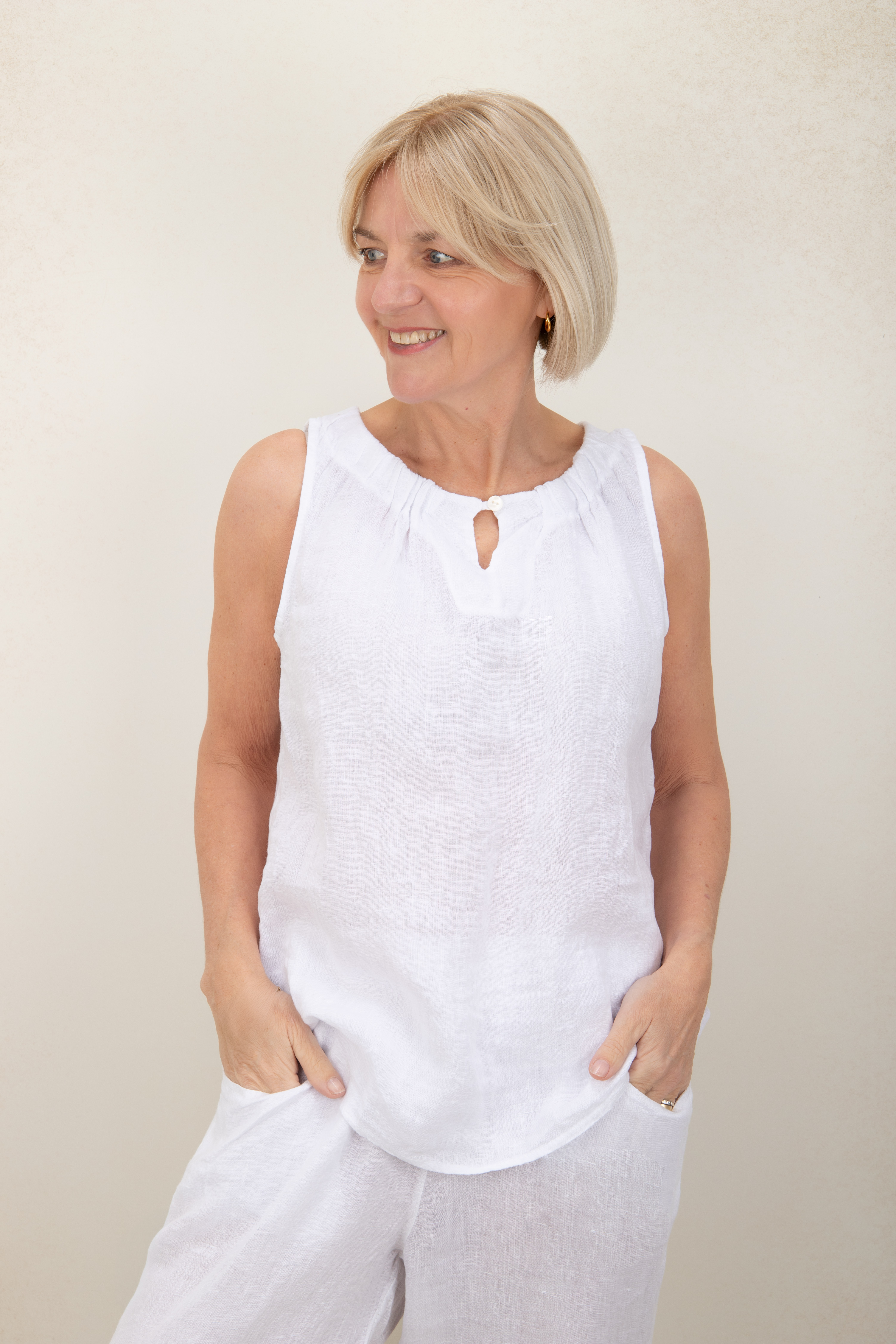New for 2026, The Laura features a relaxed A-line silhouette with a clean, sleeveless design and a flattering round neckline. Subtle button detailing and a delicate keyhole back add a simple, feminine finish. Designed to slip on with ease, it’s made from 100% linen for a light and breathable feel. Available in two sizes, it offers a comfortable fit for everyday wear. Ideal for warm weather, holidays, or layering, style with linen trousers or denim for an effortless, timeless look.