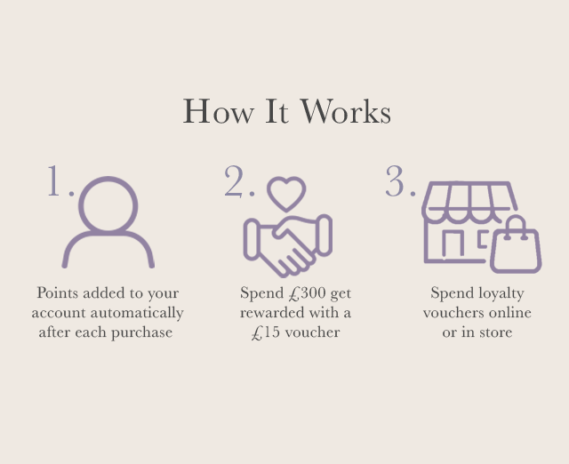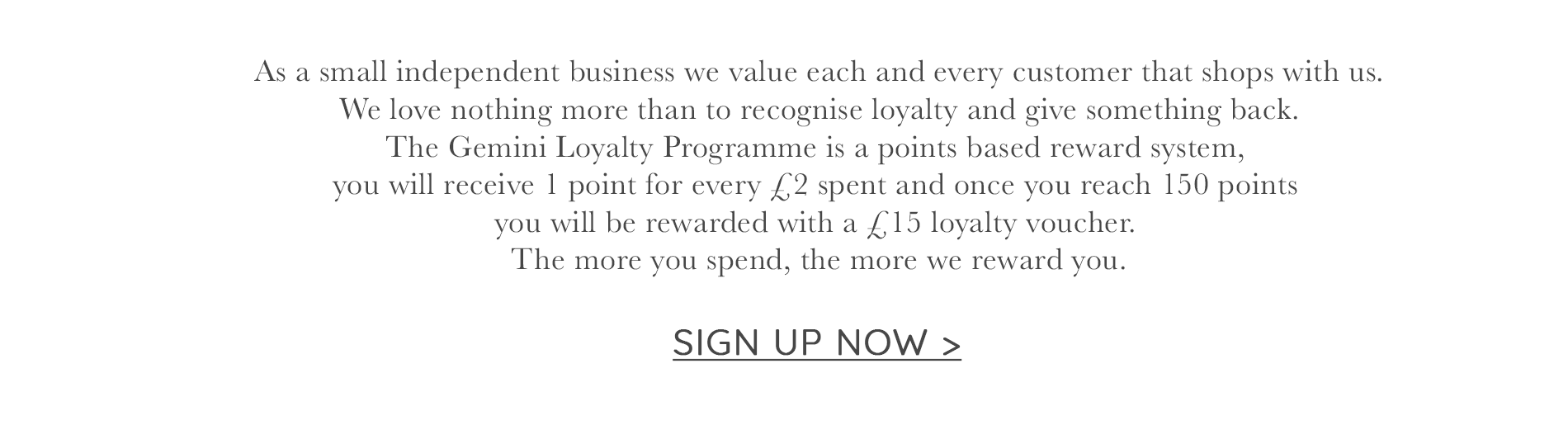 As a small independent business we value each and every customer that shops with us. We love nothing more than to recognise loyalty and give something back. The Gemini Loyalty Programme is a points based reward system, you will receive 1 point for every £2 spent and once you reach 150 points you will be rewarded with a £15 loyalty voucher to spend on any full price purchase. The more you spend, the more we reward you.