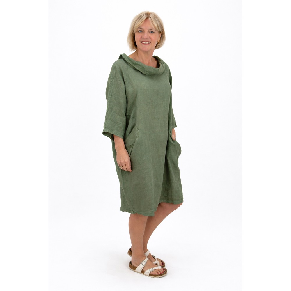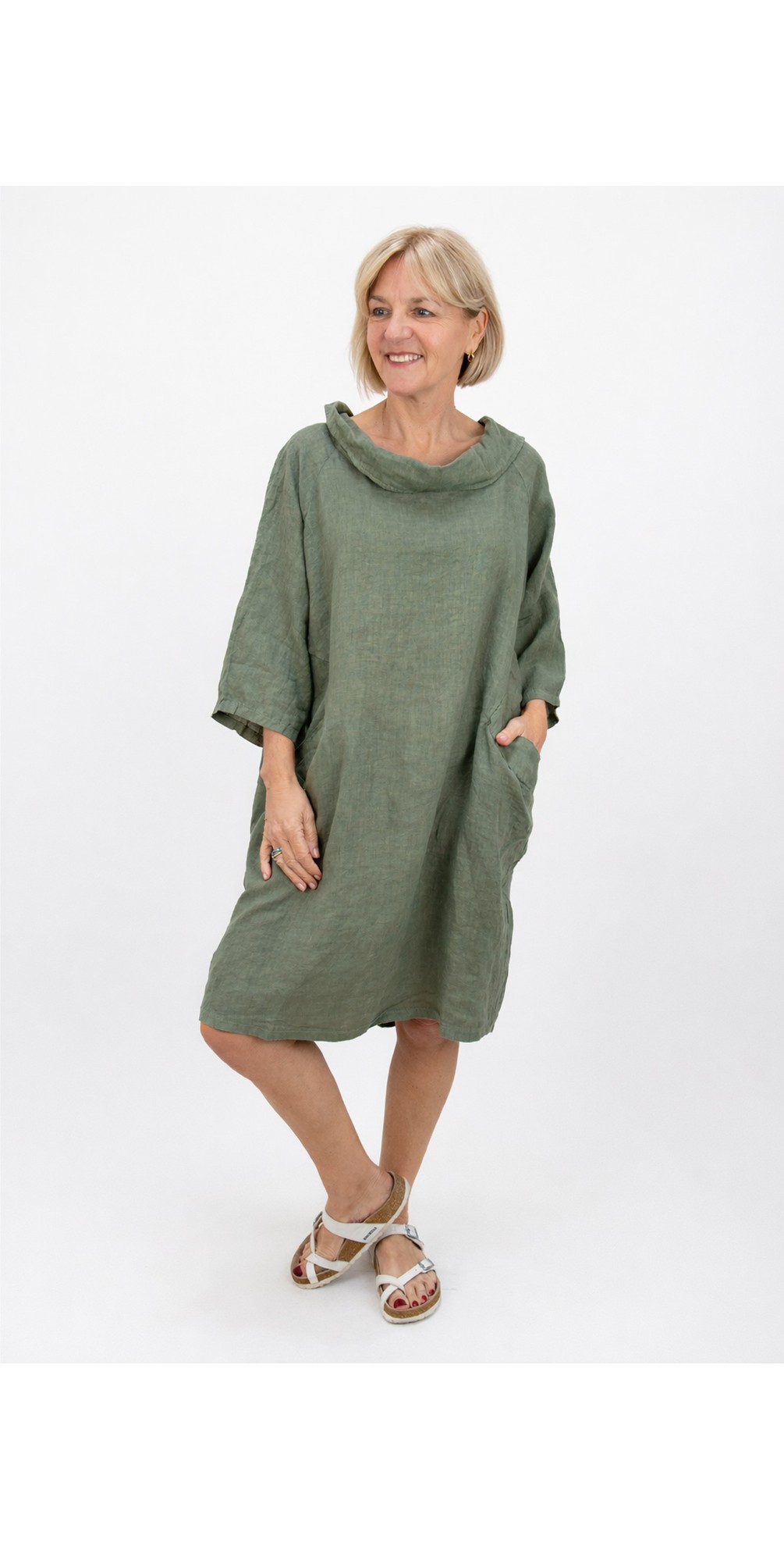 Crafted from 100% European linen, this dress offers a naturally lightweight and breathable feel, ideal for staying cool on warmer days. The soft cowl neckline adds a touch of fluid femininity, while the button-down back introduces subtle interest and a modern finish. Designed with 3/4 length sleeves and a flattering knee-length cut, it creates a versatile silhouette that’s easy to wear across seasons.