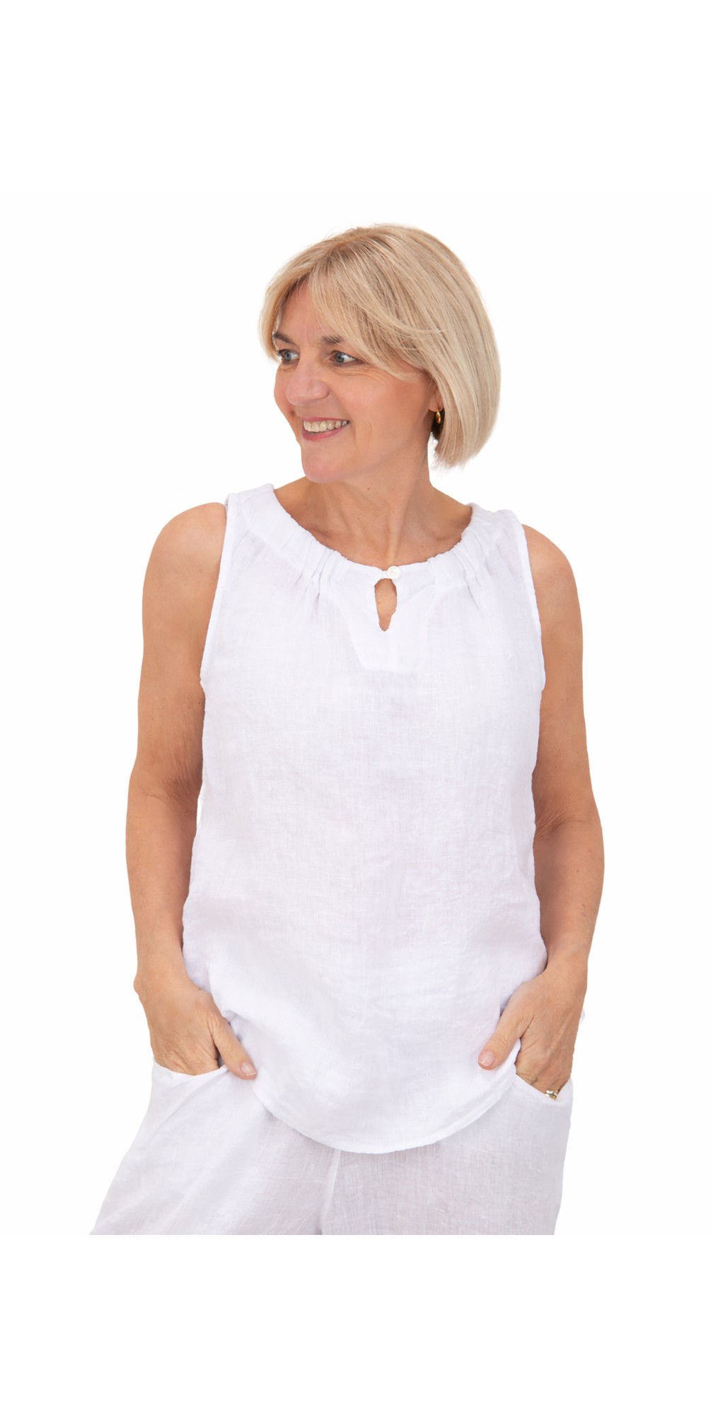 Crafted from 100% linen, this lightweight top offers a naturally cool and breathable feel, making it ideal for warmer days. The sleeveless design enhances its airy comfort, while the soft A-line shape creates a flattering, easy drape over the body. A classic round neckline is elevated with subtle button detailing, and a delicate keyhole feature adds a refined finishing touch.