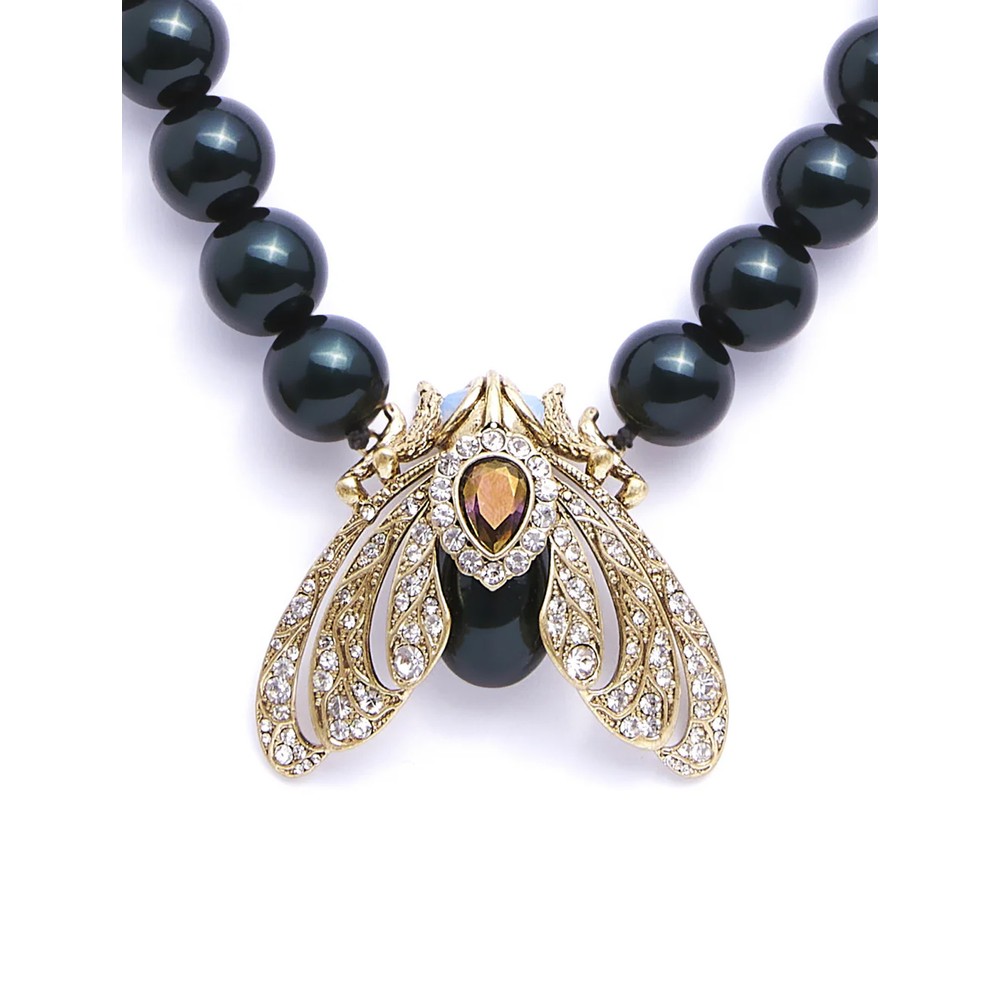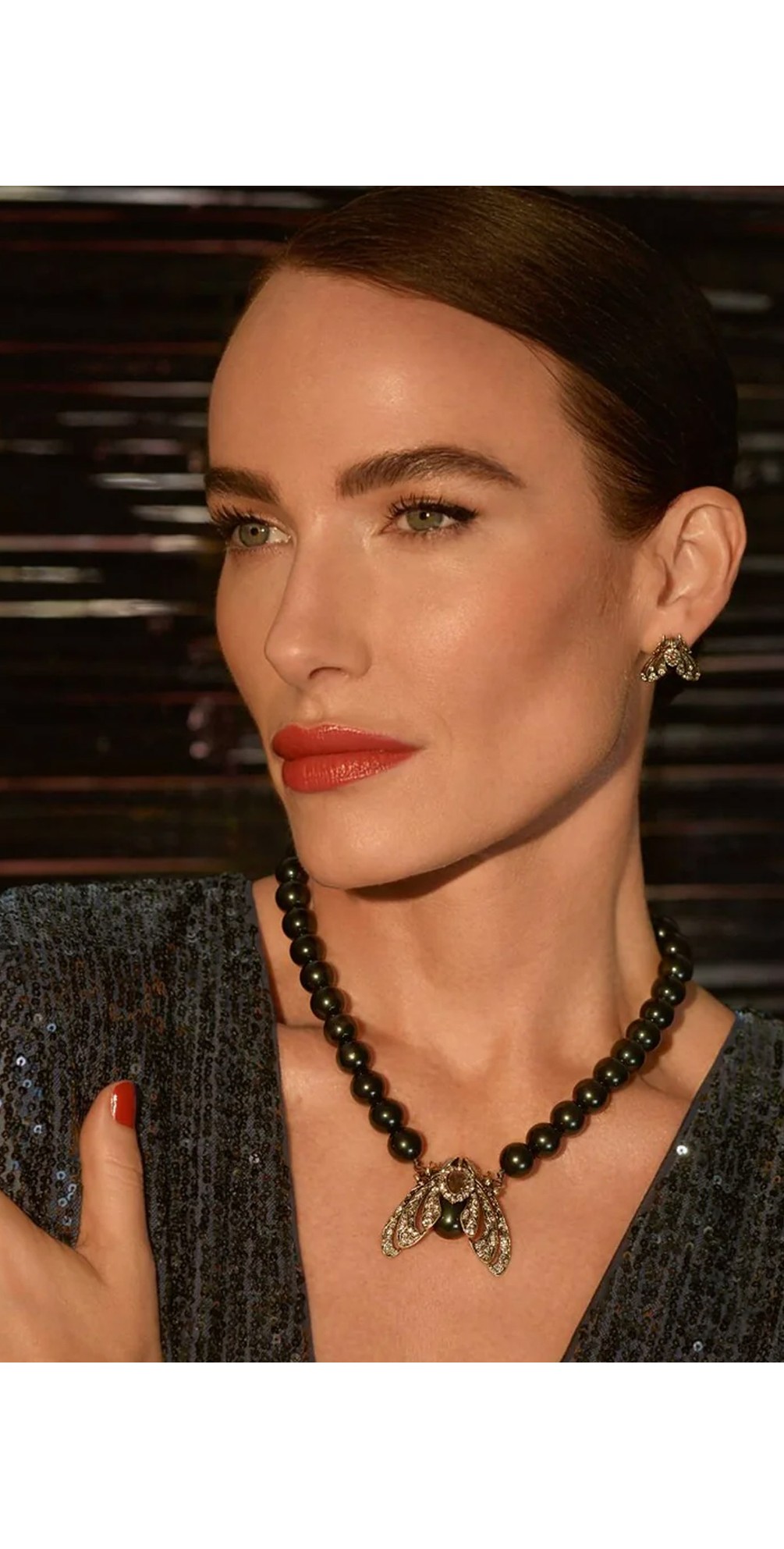 This Moth Statement Tahition Pearl Necklace is certainly a show-stopper from Bill Skinner. The centre piece of this necklace is a beautiful moth handset with decadent crystals & simulated pearls. The 18ct gold plate has a light antique finish to add that touch of vintage glamour to your outfit. Set on a stand of simulated Tahitian pearls this impressive necklace is secured with an embossed magnetic clasp.