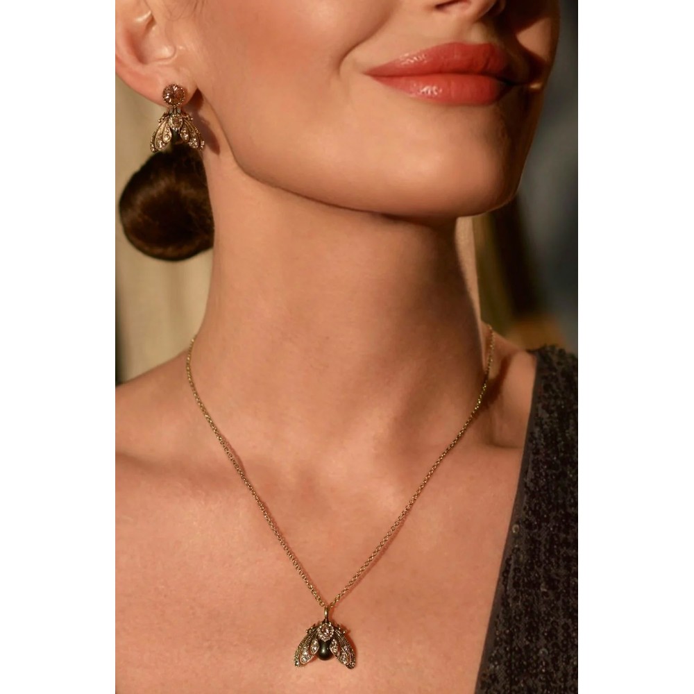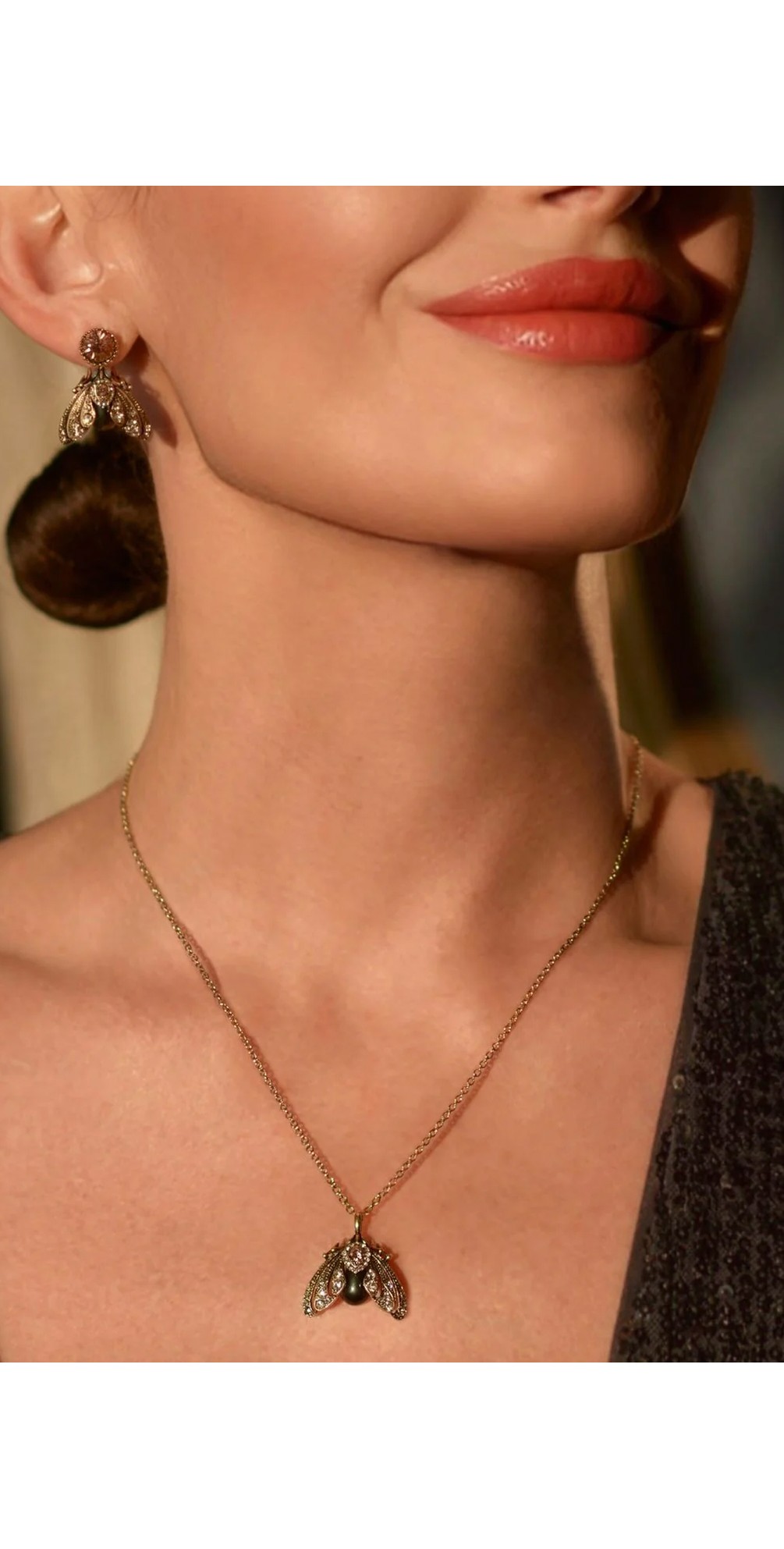This beautiful Moth Tahition Pearl Necklace from Bill Skinner is hand-set with decadent crystals & simulated pearls. The 18ct gold plate has a light antique finish to add that touch of vintage glamour to your outfit. Designed to rest gracefully near the collarbone.
