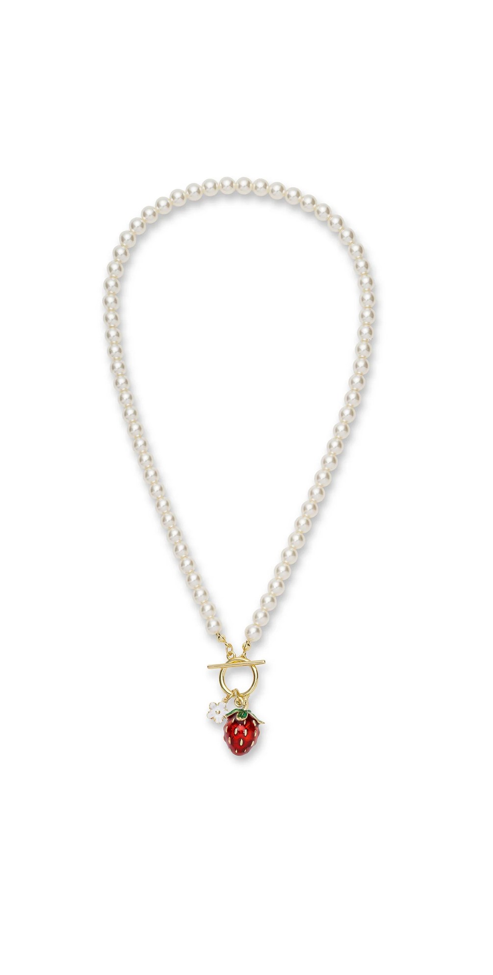 Crafted with a 14ct gold-plated finish and hand-painted enamel detailing, the necklace is set on a simulated glass pearl chain, creating a beautiful balance between classic pearls and vibrant fruit design. The intricate craftsmanship and colourful enamel bring the strawberries to life while maintaining the refined look that Bill Skinner jewellery is known for.