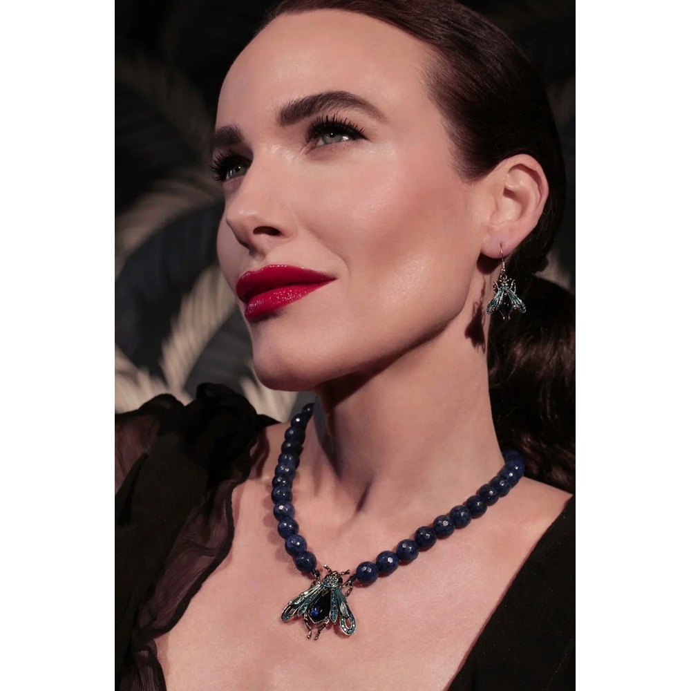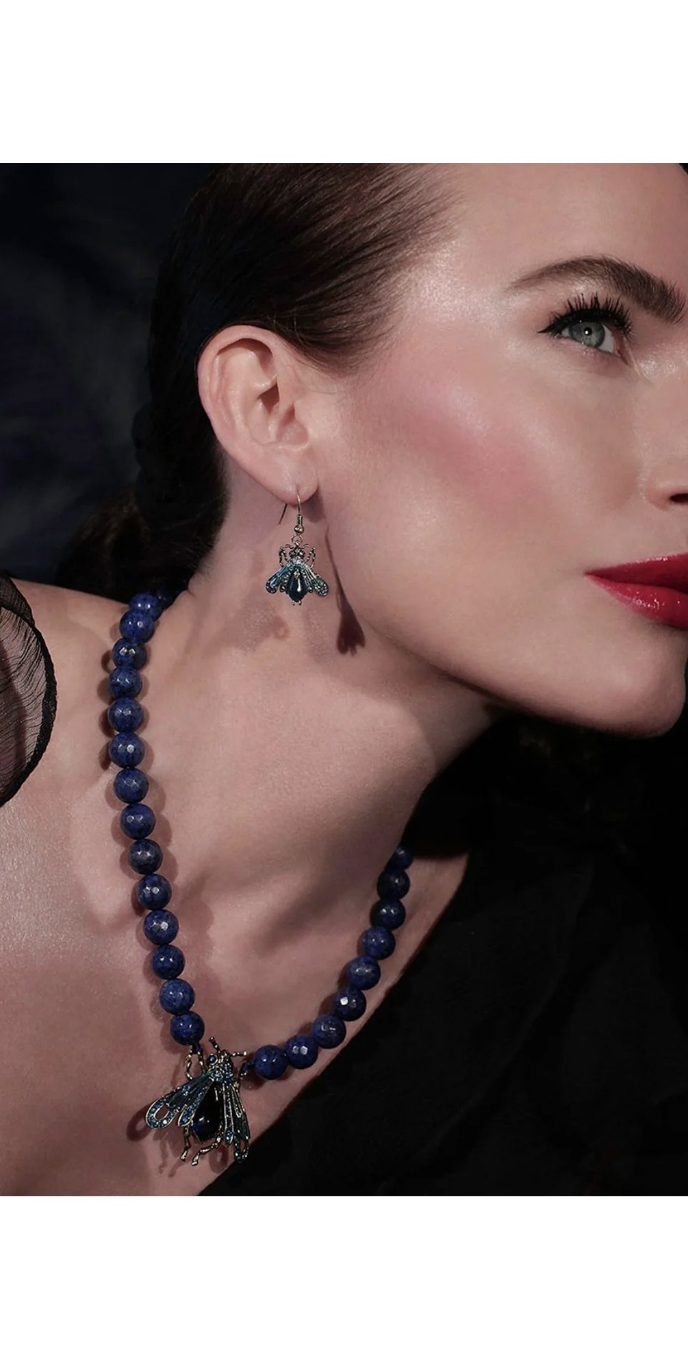 Introducing the Vintage Moth Statement Necklace, from Bill Skinner. This captivating necklace features a stunning moth design with a bespoke resin stone body, embellished with AB crystals that sparkle with exquisite brilliance. The necklace is presented on a striking lapis bead strand, known for its deep, rich colour and elegance. Finished with a secure magnetic clasp, it ensures both a seamless and stylish wearing experience.