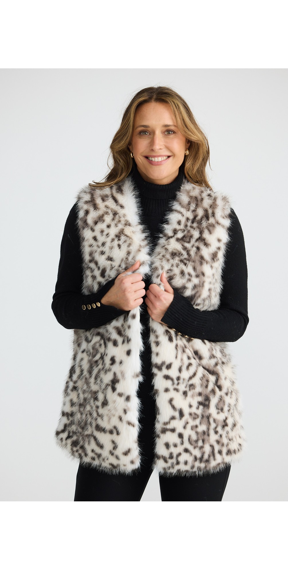 The Brave & True Aspen Fur Gilet in grey leopard print offers a sophisticated blend of style and comfort. Its longer length and flattering V-neck create an elegant silhouette, while the soft faux fur provides warmth and luxury. Practical side pockets add subtle functionality, making this gilet an ideal choice for elevating your look with a refined edge.