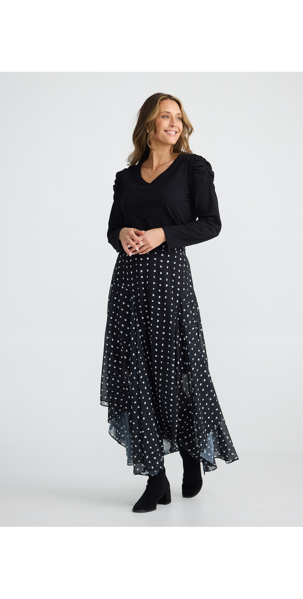 Introducing the Bella Chiffon Print Skirt from Brave & True. featuring an asymmetric cut, polka dot design, and two layers to help create flow to the silhouette. Style with a blouse for the evening, or add a knitted jumper and boots for an elevated look this season.