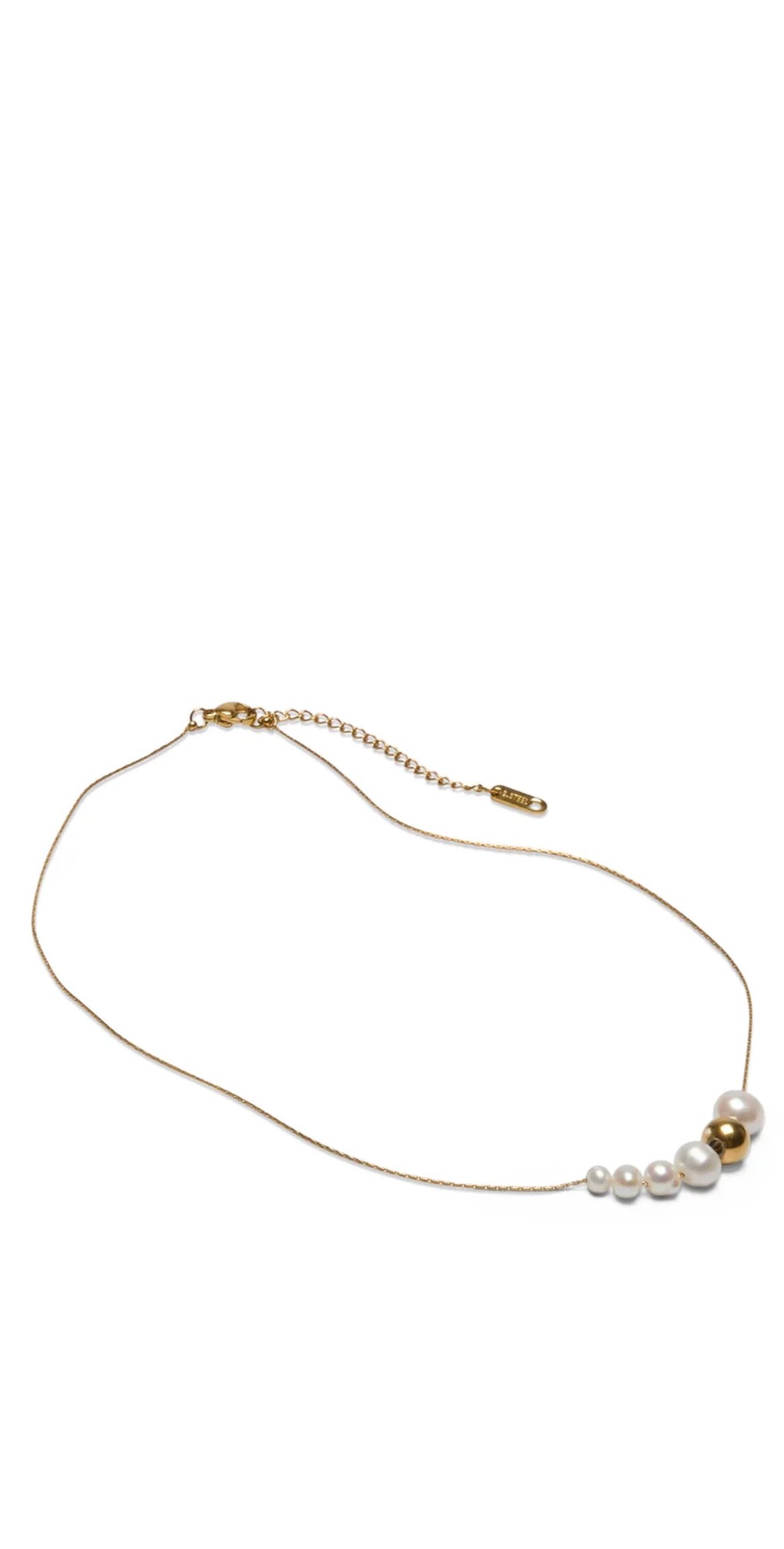 The Ashford Necklace from Chalk is a simple yet elegant piece featuring a fine gold-tone chain detailed with soft pearl-style beads and a single polished gold ball. Lightweight and beautifully minimal, it adds a touch of refined shine to any outfit and layers effortlessly with other pieces.
