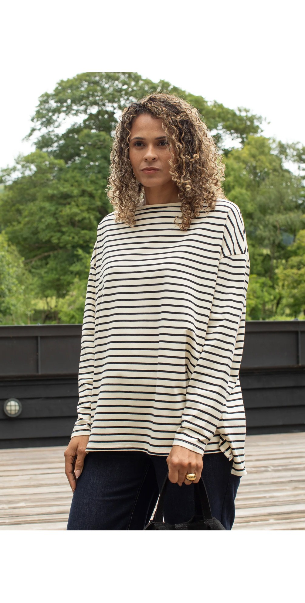 The Bryony X Stripe Top from Chalk Clothing features a black and cream stripe, long sleeves, a boat neckline, and a boxy fit. Made from a cotton blend, this top is soft against your skin and looks great paired on its own with jeans or trousers, or layered underneath a casual jumpsuit.