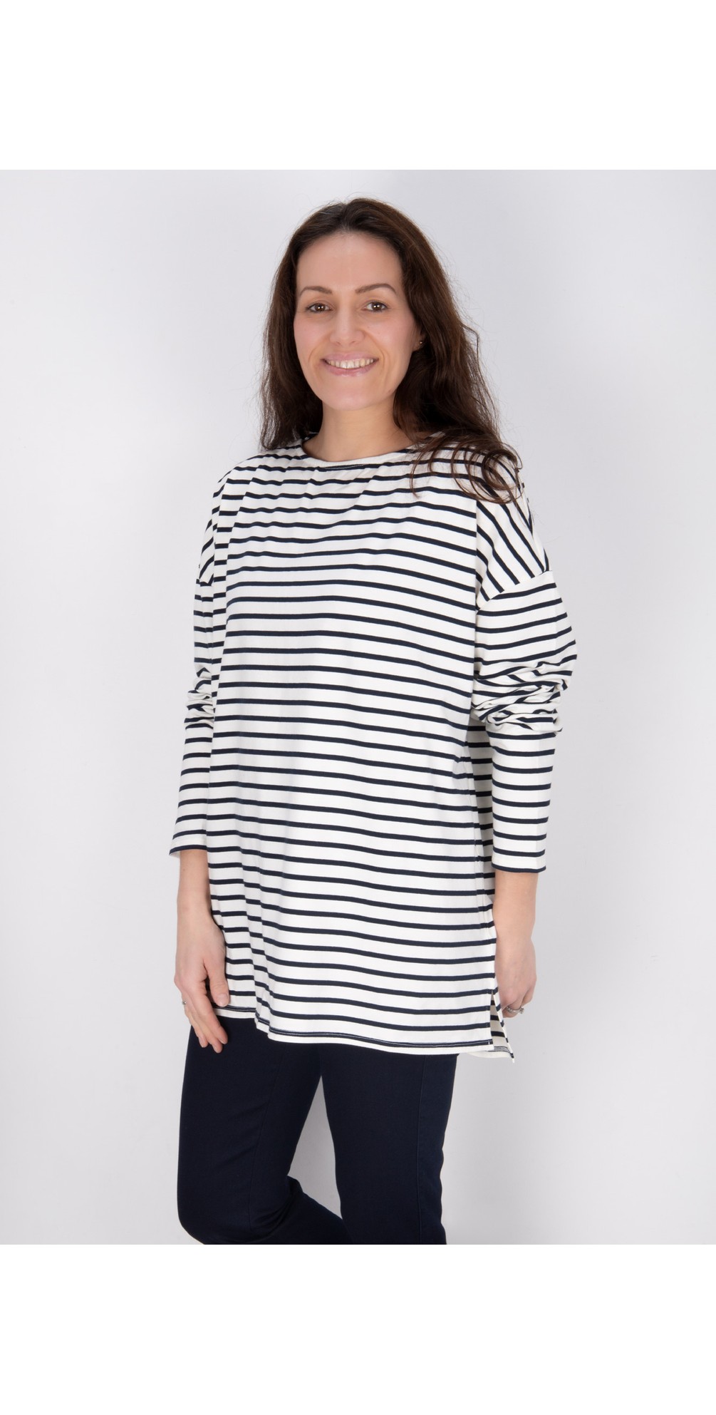 The Bryony Stripe Top from Chalk Clothing kin navy and white stripe features long sleeves, a boat neckline, and boxy fit. Made from a cotton blend, this top is soft against your skin and looks great paired on it's own with jeans or trousers, or layered underneath a casual jumpsuit.