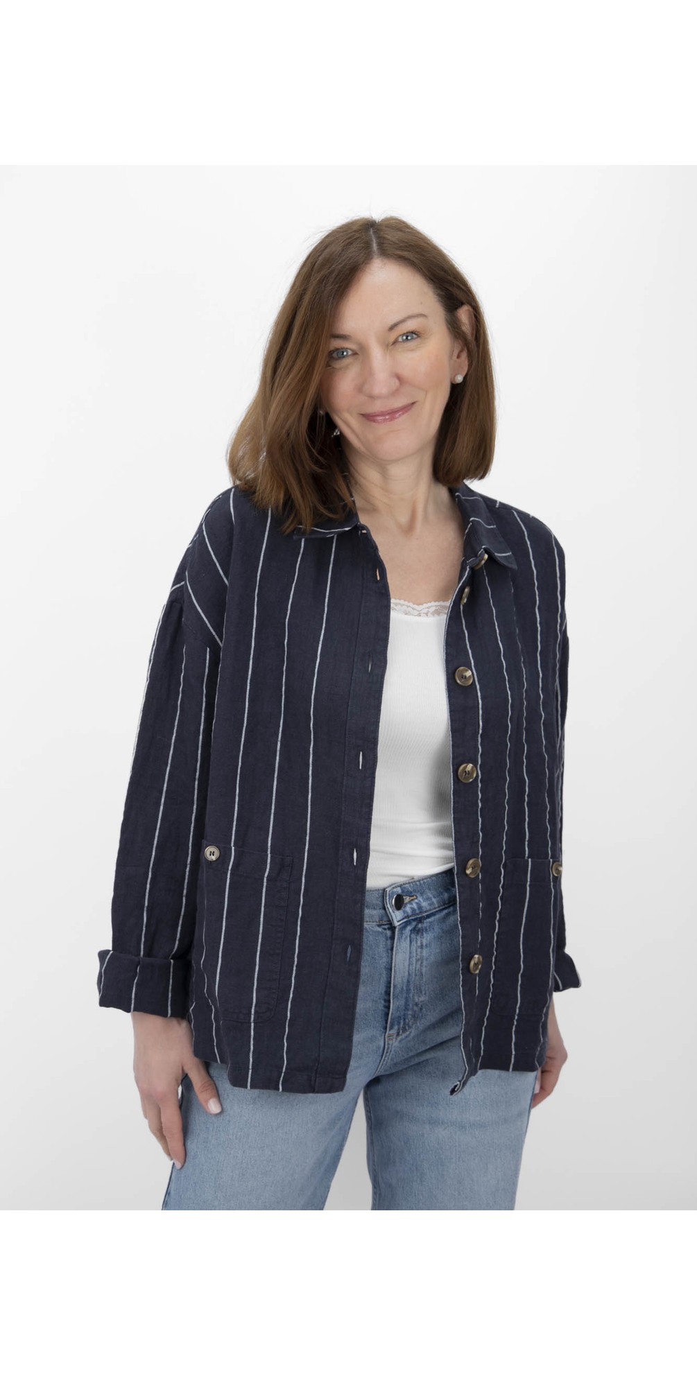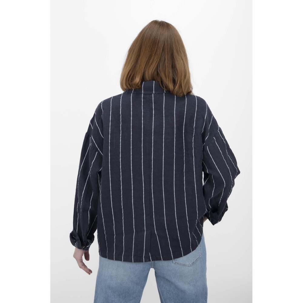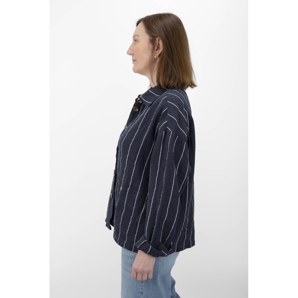 Crafted with a utility-inspired shape, the Kath Stripe Jacket features a classic collar and button-front closure for timeless styling. The relaxed, boxy cut makes it easy to layer over knitwear or shirts, while patch pockets at the hips add practical detail and everyday functionality. The striped fabric gives the jacket subtle texture and a distinctive character that elevates simple outfits.