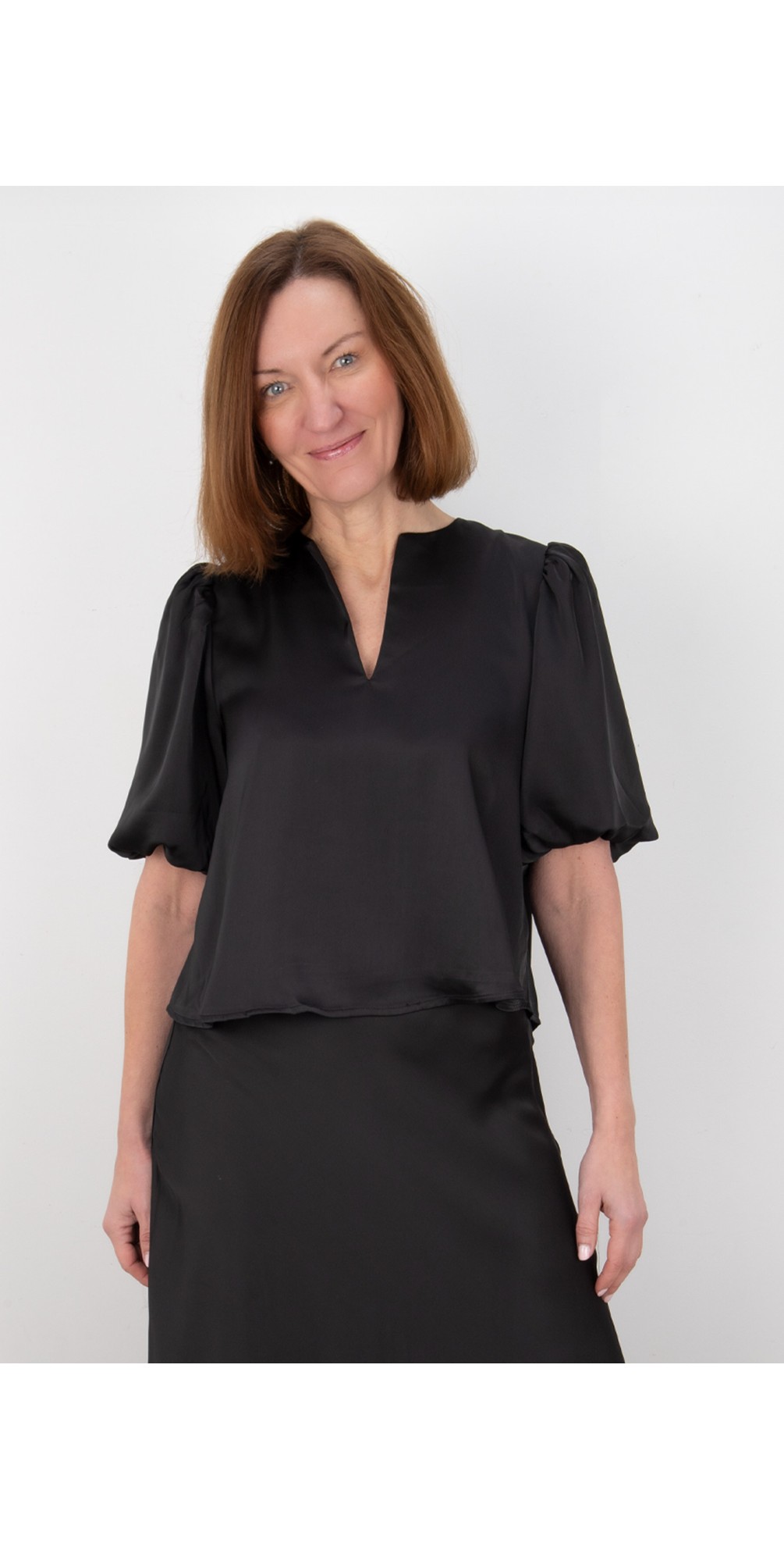 The Chalk Porcha Top in Black is a sleek satin-style party top designed to elevate your evening wardrobe. This lightweight, flowing blouse features a subtle V-neckline, short puff sleeves, and a slightly cropped length that makes it ideal for pairing with high-waisted skirts or trousers. A single pleat down the back adds elegant movement and tailored detail — perfect for dressing up for the night or layering under a jacket.
