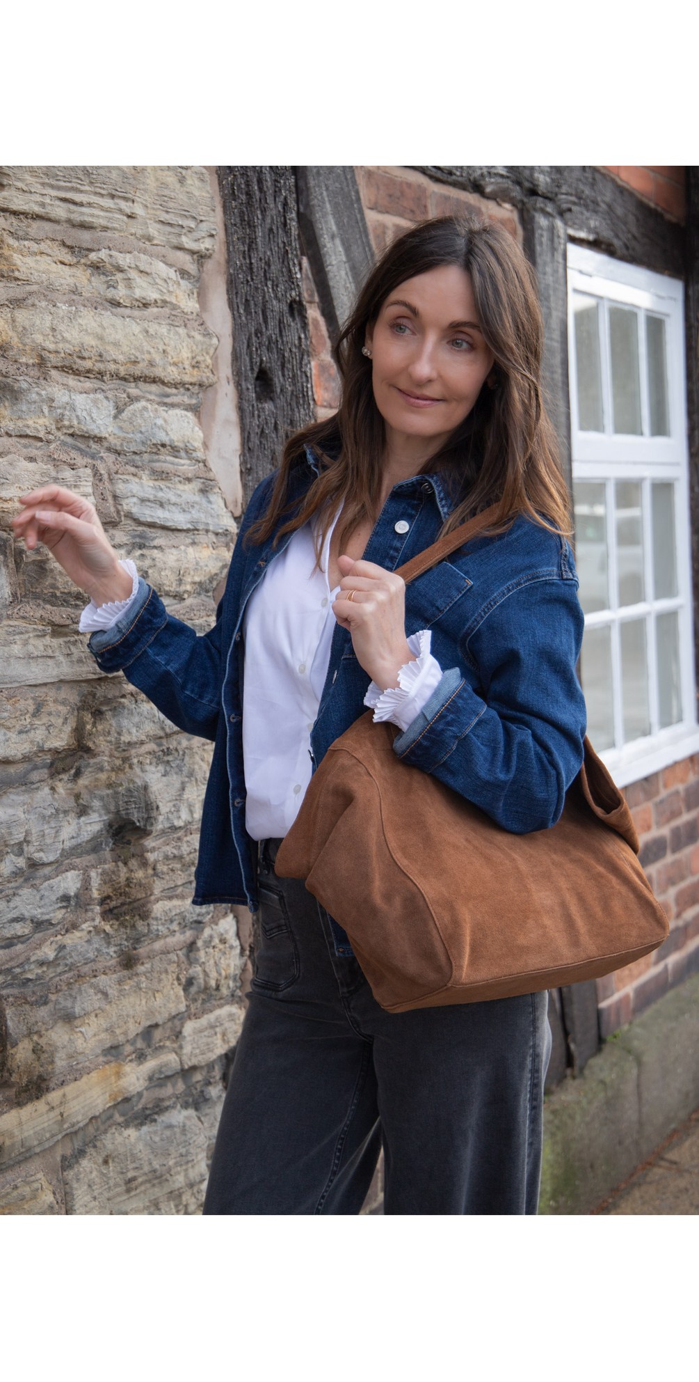 Introducing the Soho Slouch Tote Bag from Chalk. Featuring a short handle and a longer shoulder handle making it both practical and stylish. Finished in a rich deep tan suede, with a sleek magnetic fastening. Fully cotton lined with inner zipped pocket for your valuables. This bag is an autumn staple following th key tends of suede this season.