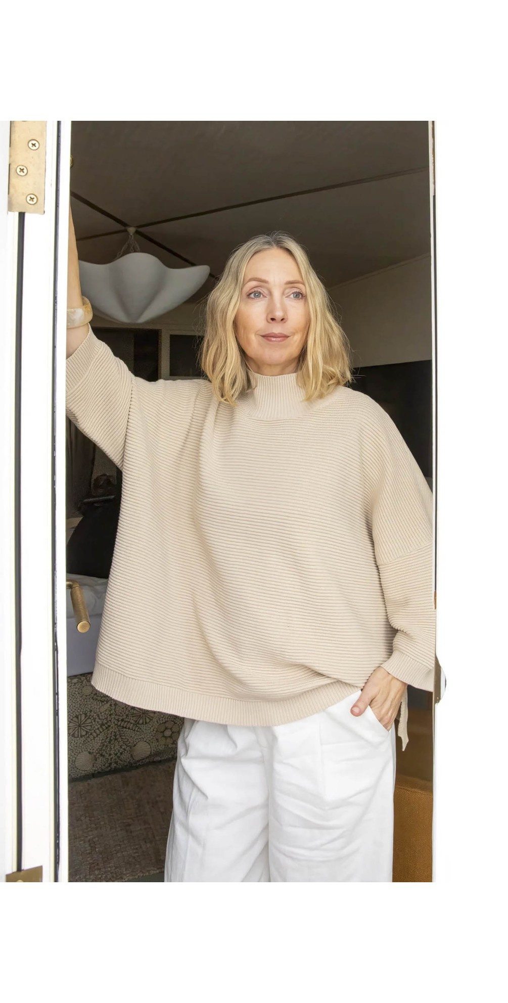 The best-selling Vicki Cotton Rib Jumper from Chalk is made from easy to wear and care cotton. With an all-over rib knit, flattering funnel neck, statement side splits and loose boxy shape this one-size knit is a simple and understated all-year-round wardrobe essential. The perfect jumper for laid-back style which looks great worn layered over a plain or striped T-shirt and your favourite jeans or joggers.