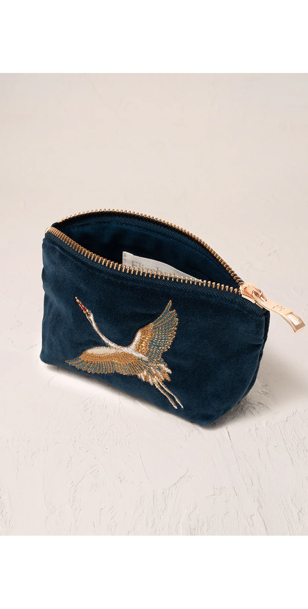 • Soft velvet exterior with hand-embroidered crane design
