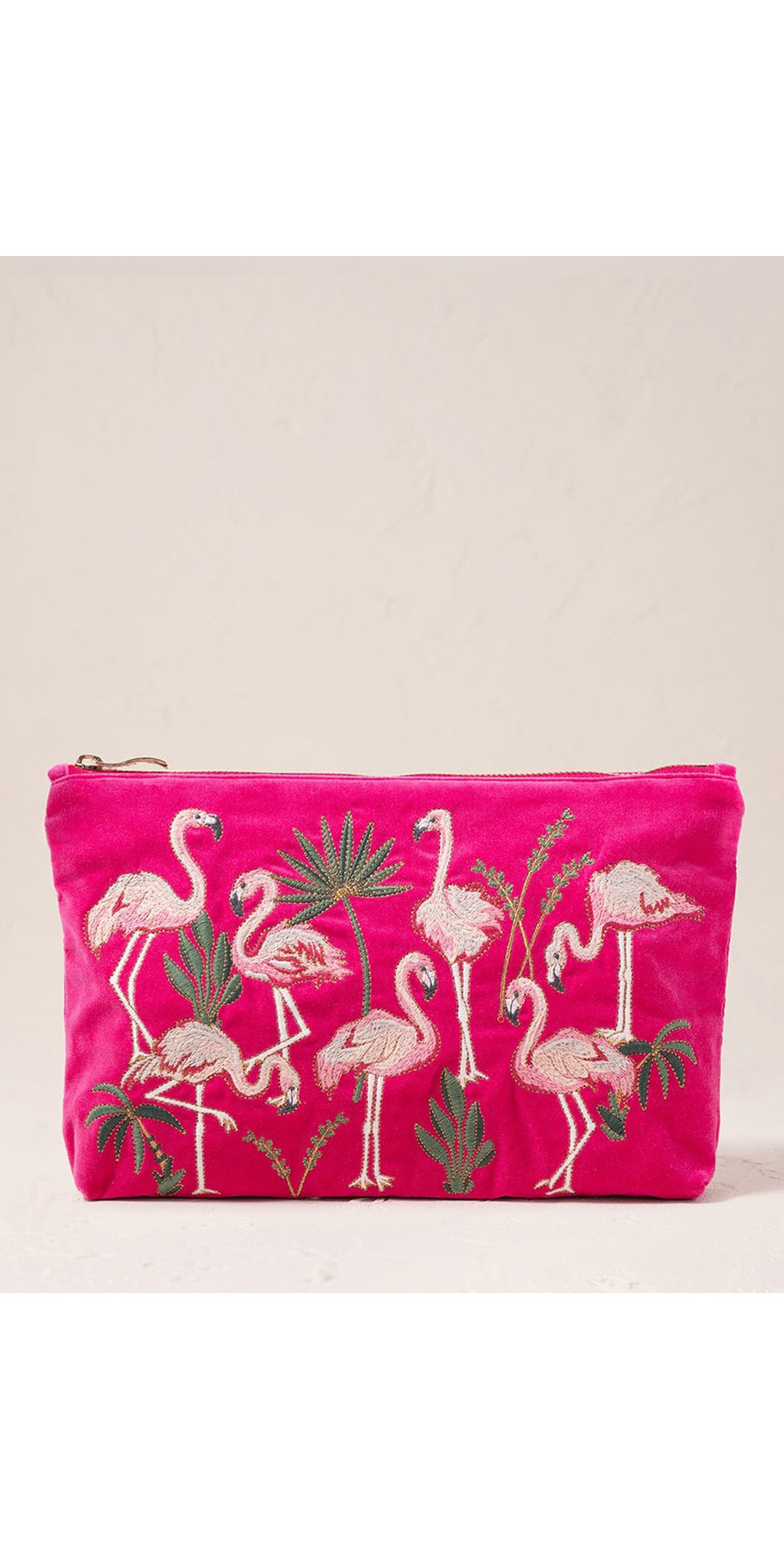 Elizabeth Scarlett Flamingos Pink Embroidered Velvet Pouch