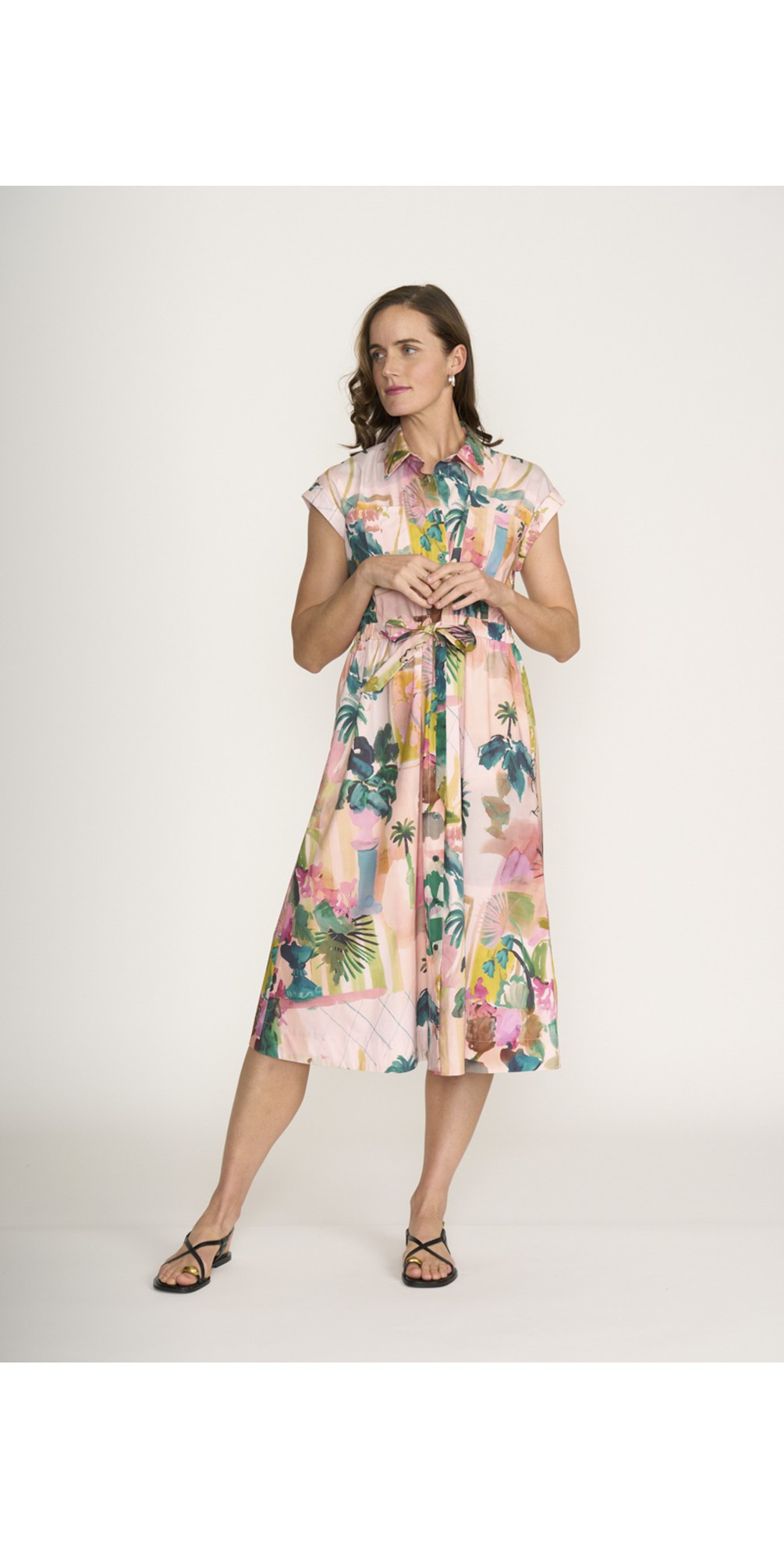 Crafted from lightweight, breathable fabric, it features a button-up front and a flattering tie waist to define the silhouette. Cuffed short sleeves add a refined touch, while multiple pockets—including front and side pockets—bring both style and practicality. Perfect for warm-weather dressing, this versatile midi dress transitions seamlessly from casual days to more polished occasions.