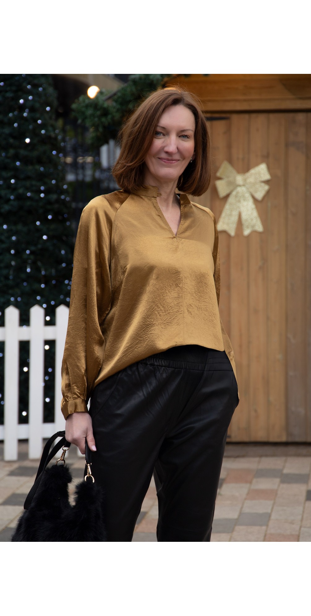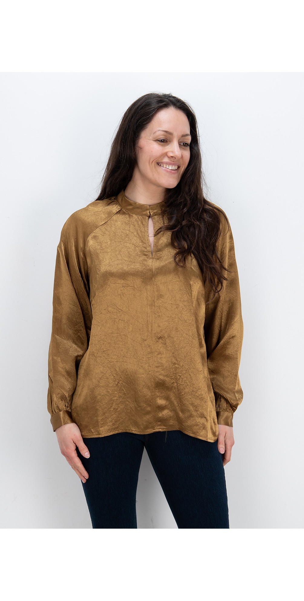 Foils crackin' blouse in bronze is the perfect evening shirt for autumn. style it with the crackin' maxi skirt in bronze as a matching coord or a pair of jeans for a simpler look. Long sleeve, v-neck line, or button up for a more modest look is the shirt of the season!