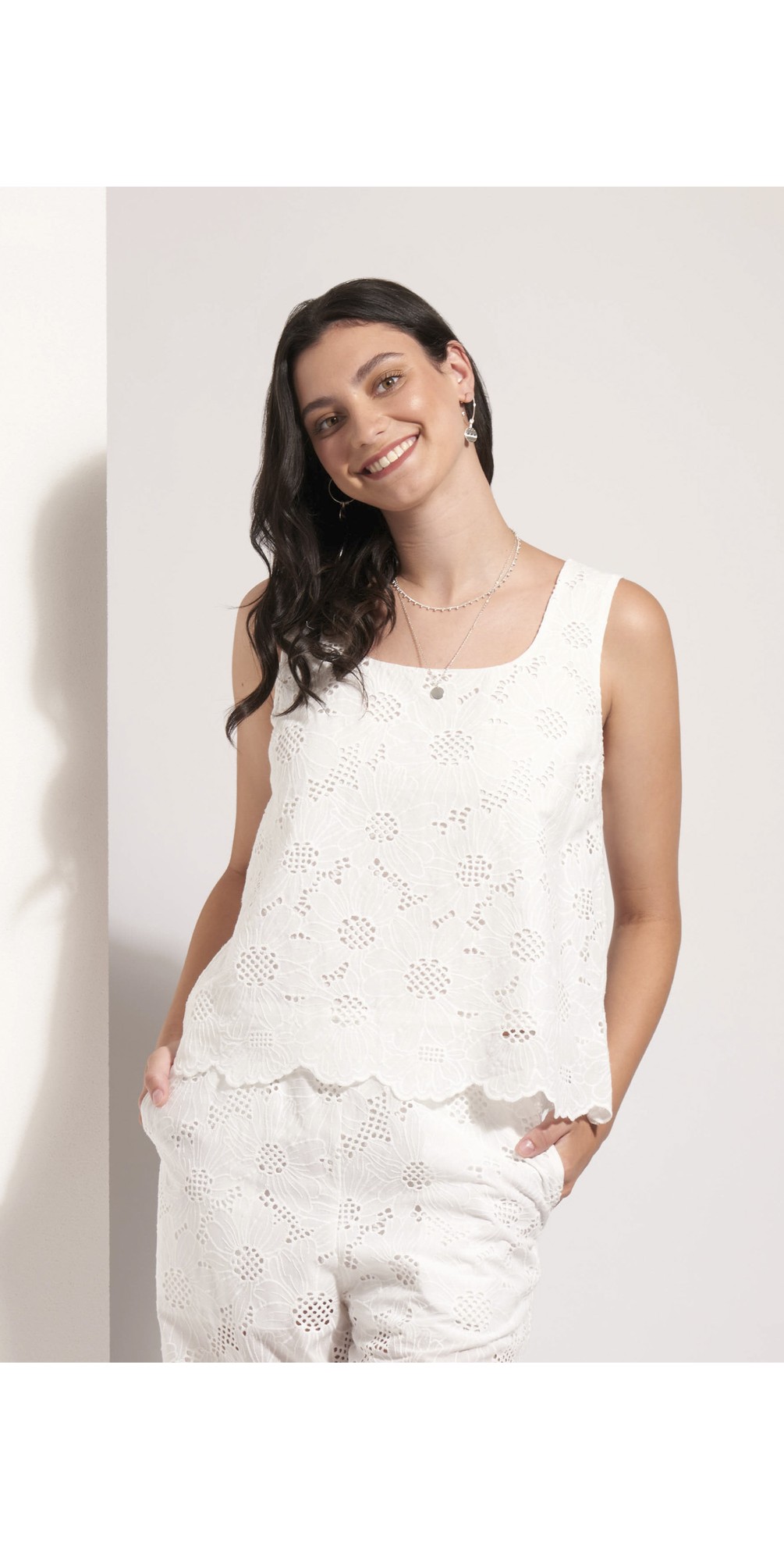 The Flower-ful Shell Top by Foil is an effortlessly feminine women’s top designed for light, elegant summer dressing. Featuring delicate floral broderie anglaise, this beautifully detailed piece combines timeless charm with a fresh, modern feel.