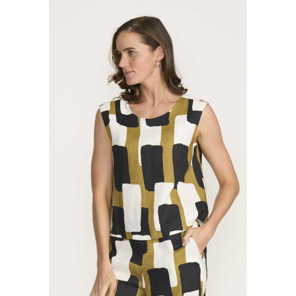 The Natural Art Box Linen Print Top is a contemporary women’s sleeveless top that blends artistic design with effortless everyday style. This piece brings modern character to warm-weather dressing. Crafted from breathable linen, the top is cut in a boxy regular fit for relaxed comfort and easy movement. Measuring approximately 54cm in length on a UK size 10, it offers a neat, flattering silhouette that pairs perfectly with linen trousers, denim, or skirts. A subtle V slit at the back of the neck adds a refined detail, while a central back pleat creates gentle structure and shape. Lightweight and versatile, this linen print top is ideal for layering or wearing alone on warmer days.