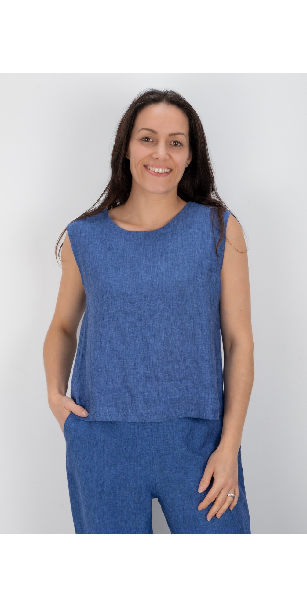The Its Only Natural Linen Top is a contemporary women’s sleeveless top that blends artistic design with effortless everyday style. This piece brings modern character to warm-weather dressing. Crafted from breathable linen, the top is cut in a boxy regular fit for relaxed comfort and easy movement. Measuring approximately 54cm in length on a UK size 10, it offers a neat, flattering silhouette that pairs perfectly with linen trousers, denim, or skirts. A subtle V slit at the back of the neck adds a refined detail, while a central back pleat creates gentle structure and shape. Lightweight and versatile, this linen print top is ideal for layering or wearing alone on warmer days.