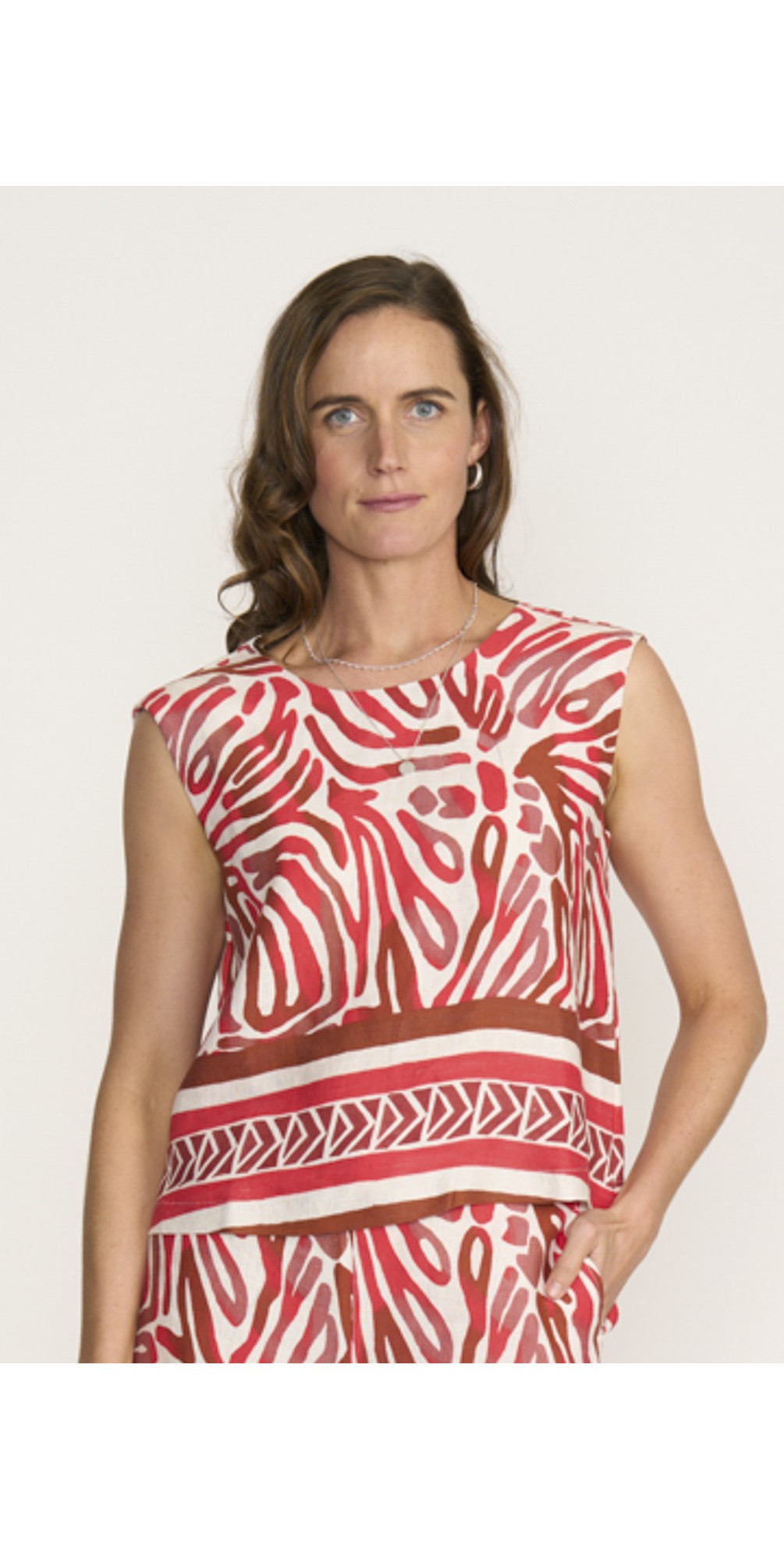 The Its Only Natural Linen Top is a contemporary women’s sleeveless top that blends artistic design with effortless everyday style. This piece brings modern character to warm-weather dressing. Crafted from breathable linen, the top is cut in a boxy regular fit for relaxed comfort and easy movement. Measuring approximately 54cm in length on a UK size 10, it offers a neat, flattering silhouette that pairs perfectly with linen trousers, denim, or skirts. A subtle V slit at the back of the neck adds a refined detail, while a central back pleat creates gentle structure and shape. Lightweight and versatile, this linen print top is ideal for layering or wearing alone on warmer days.