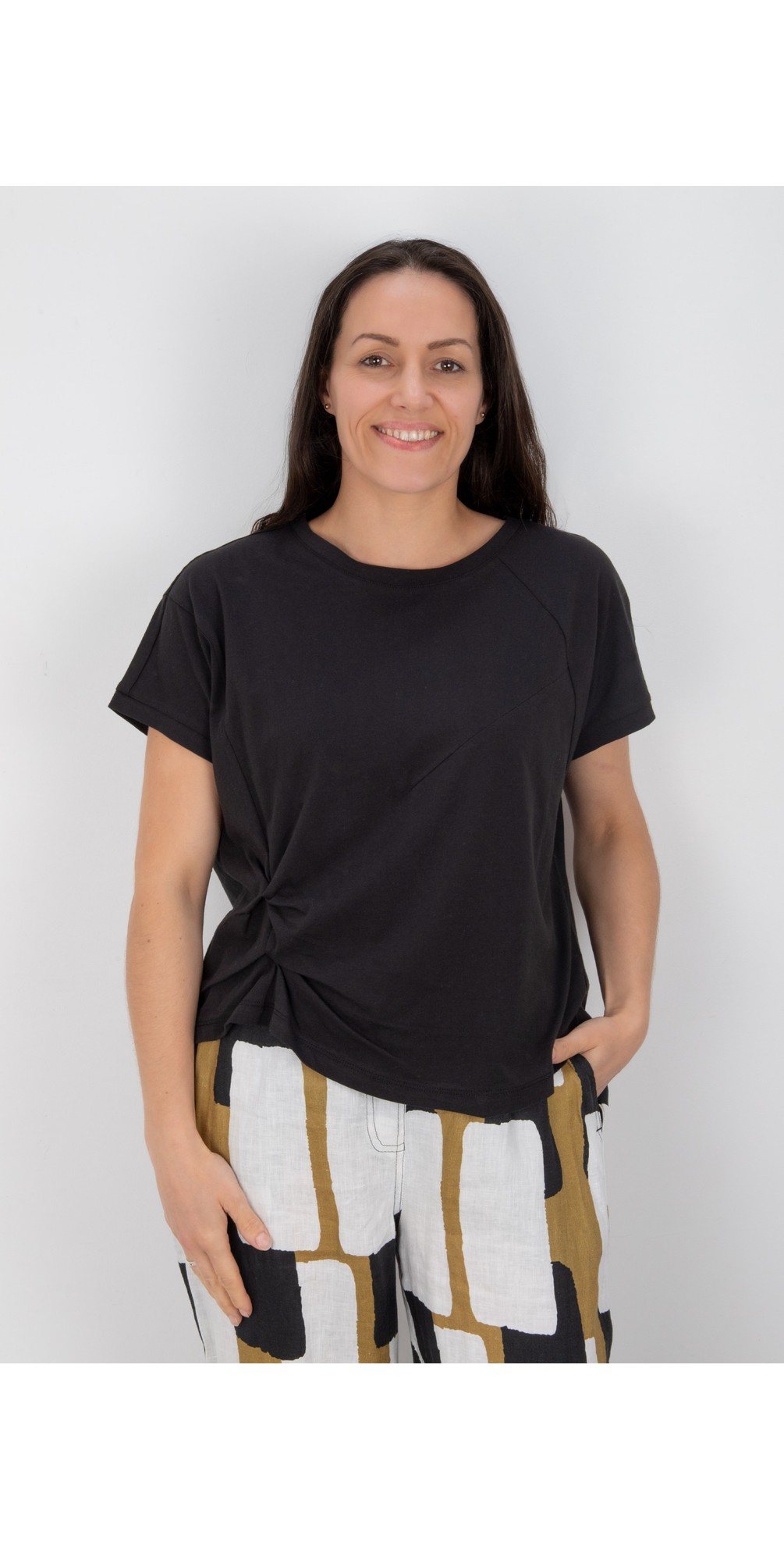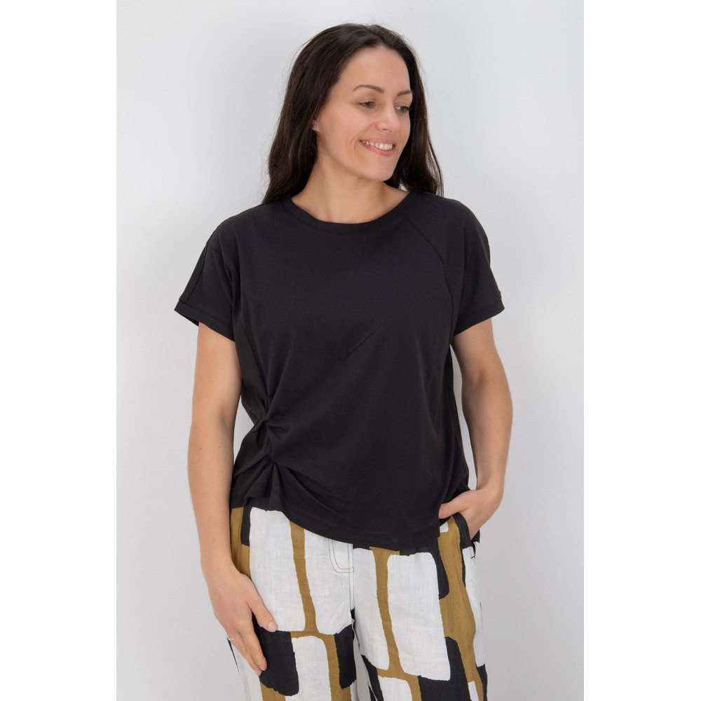 Featuring a round neckline and short sleeves, the tee offers comfortable, versatile wear. The asymmetrical hemline creates a flattering, directional finish, while ruched detailing adds soft texture and shape for a more refined look. Perfect for pairing with jeans, tailored trousers, or skirts, this top transitions seamlessly from casual daytime outfits to relaxed evening styling.