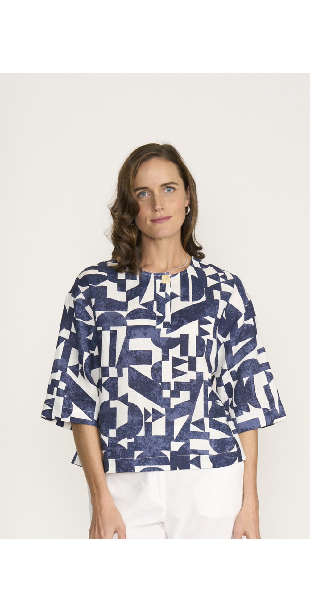 Designed with a classic round neckline and mid-length sleeves, the silhouette is both flattering and versatile. The front button detail adds subtle structure and styling interest, making it perfect for dressing up simple trousers or pairing with relaxed denim for a more casual look.