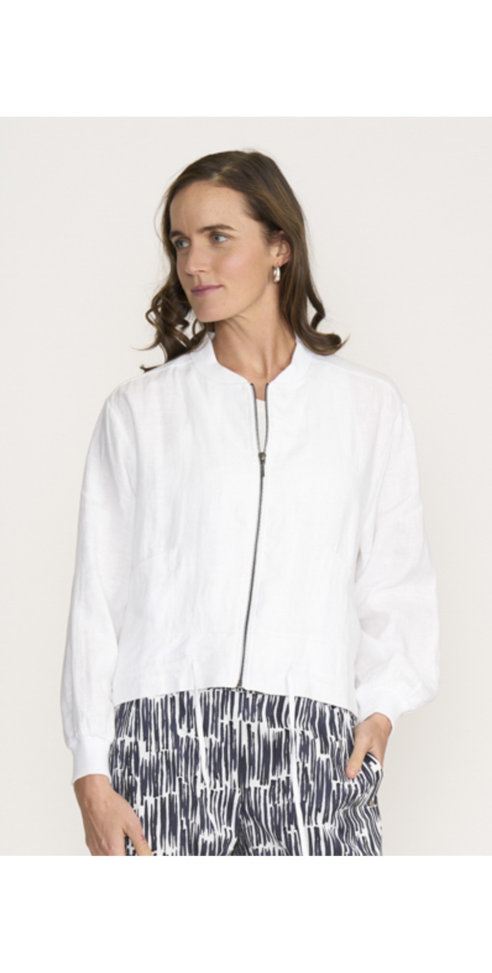 Crafted from a lightweight, breathable fabric, this jacket features a clean round neckline and a zip-up front for easy wear. Full-length sleeves provide added coverage, while the adjustable drawstring hem allows you to personalise the fit for a more defined or relaxed silhouette. Functional side pockets add everyday practicality, making it as useful as it is stylish.