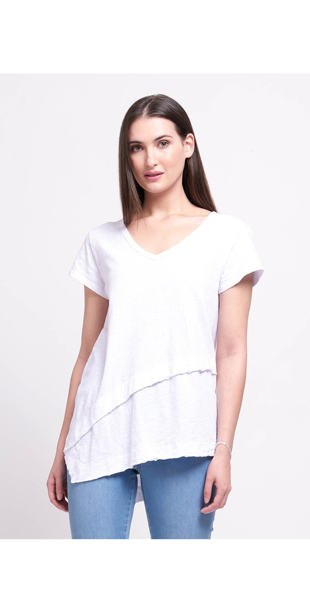 Add this soft cotton tee from Foil into your capsule wardrobe. The Best Angle Tee features a soft V neckline, short sleeves, and an asymmetric seam detail across the front of the top, and hem, for a modern twist on a classic silhouette.
