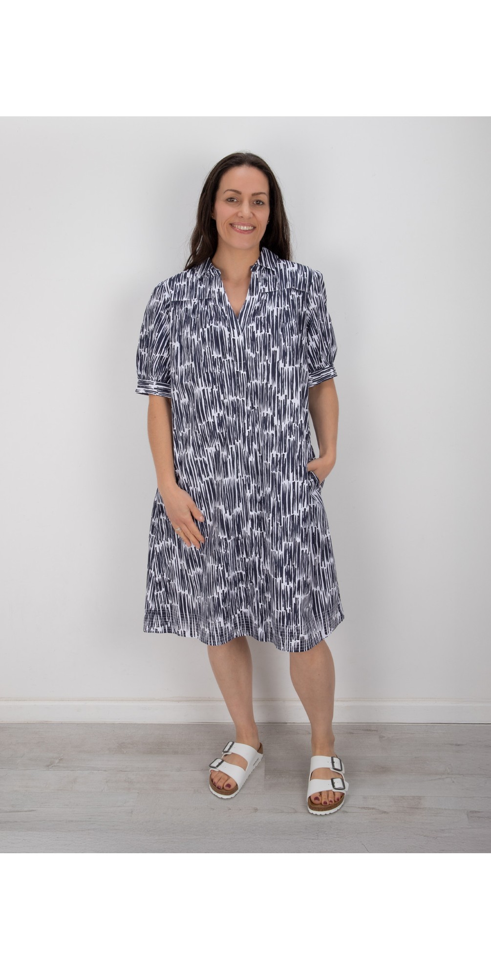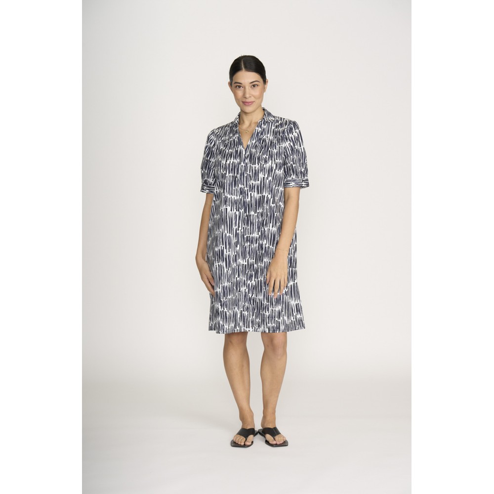 Styled with a flattering V neckline and classic collar, the dress offers a smart yet feminine finish. The short balloon-style sleeves add soft volume and modern shape, while the button-up front enhances its timeless appeal. Falling to a knee-length cut, it creates an easy, wearable silhouette perfect for both daytime outings and casual occasions.