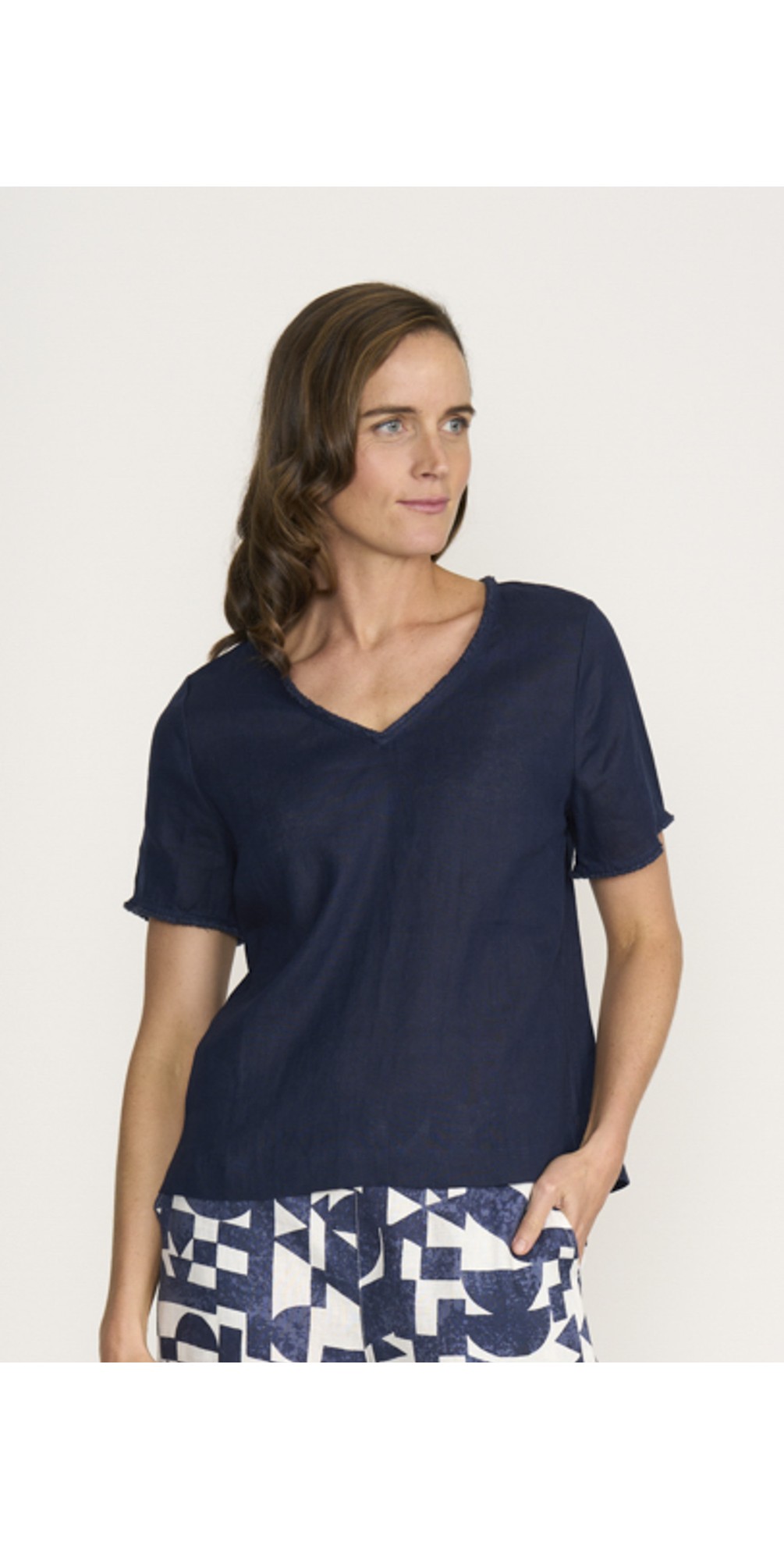 Featuring a flattering V-neckline and short sleeves, the silhouette is clean and versatile, perfect for warm-weather dressing. Subtle frayed edge detailing adds a modern, textural finish, giving this classic linen top a contemporary twist. Easy to pair with linen trousers, denim, or skirts, it’s a wardrobe staple you’ll reach for season after season.