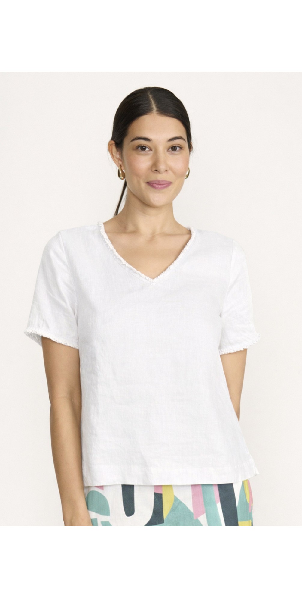 Featuring a flattering V-neckline and short sleeves, the silhouette is clean and versatile, perfect for warm-weather dressing. Subtle frayed edge detailing adds a modern, textural finish, giving this classic linen top a contemporary twist. Easy to pair with linen trousers, denim, or skirts, it’s a wardrobe staple you’ll reach for season after season.