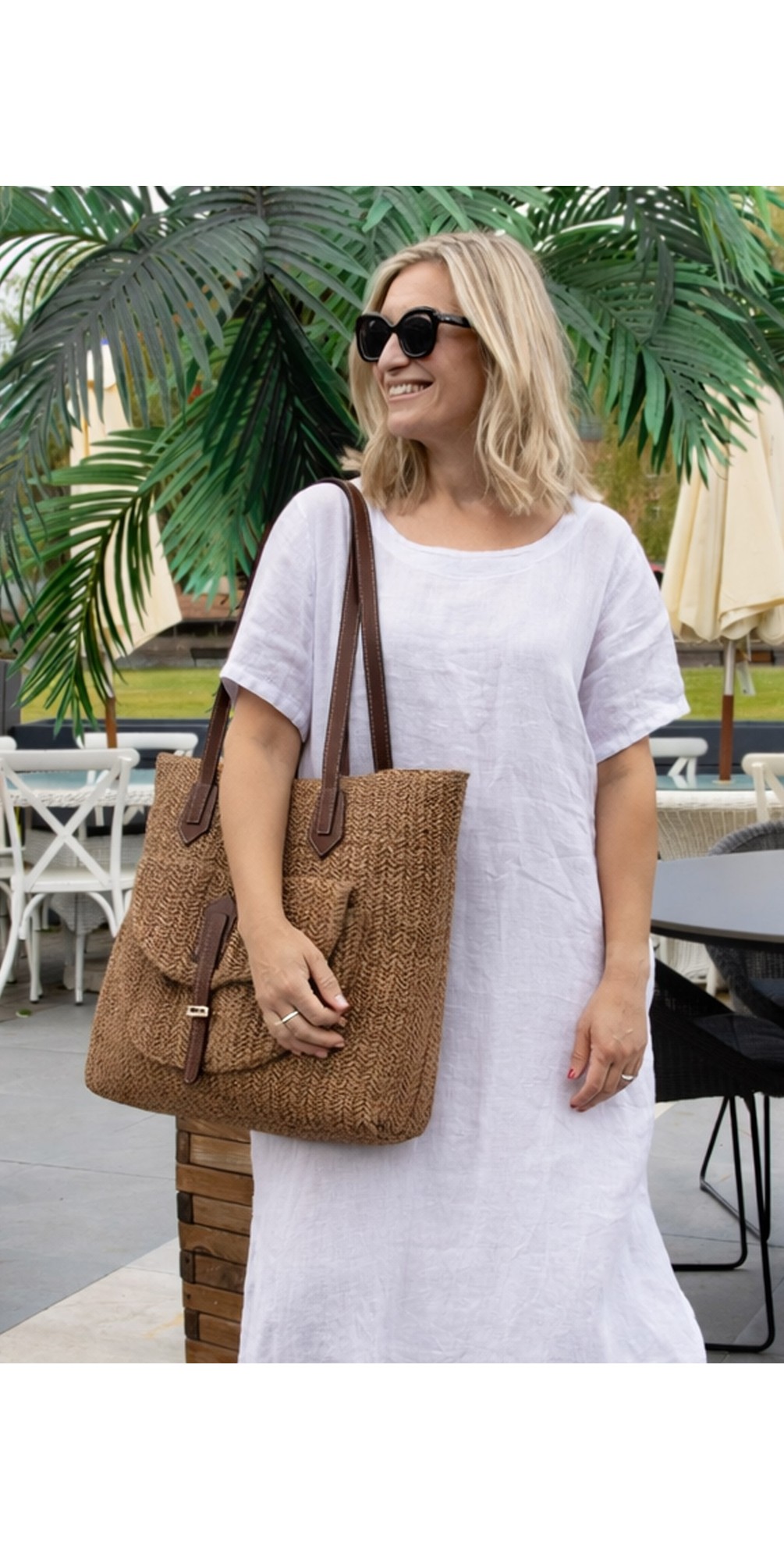 Shop the Antigua Woven Tote Bag, crafted from woven paper with PU leather handles and pocket fastening. Lightweight, spacious, and perfect for beach days, travel, and everyday summer style.