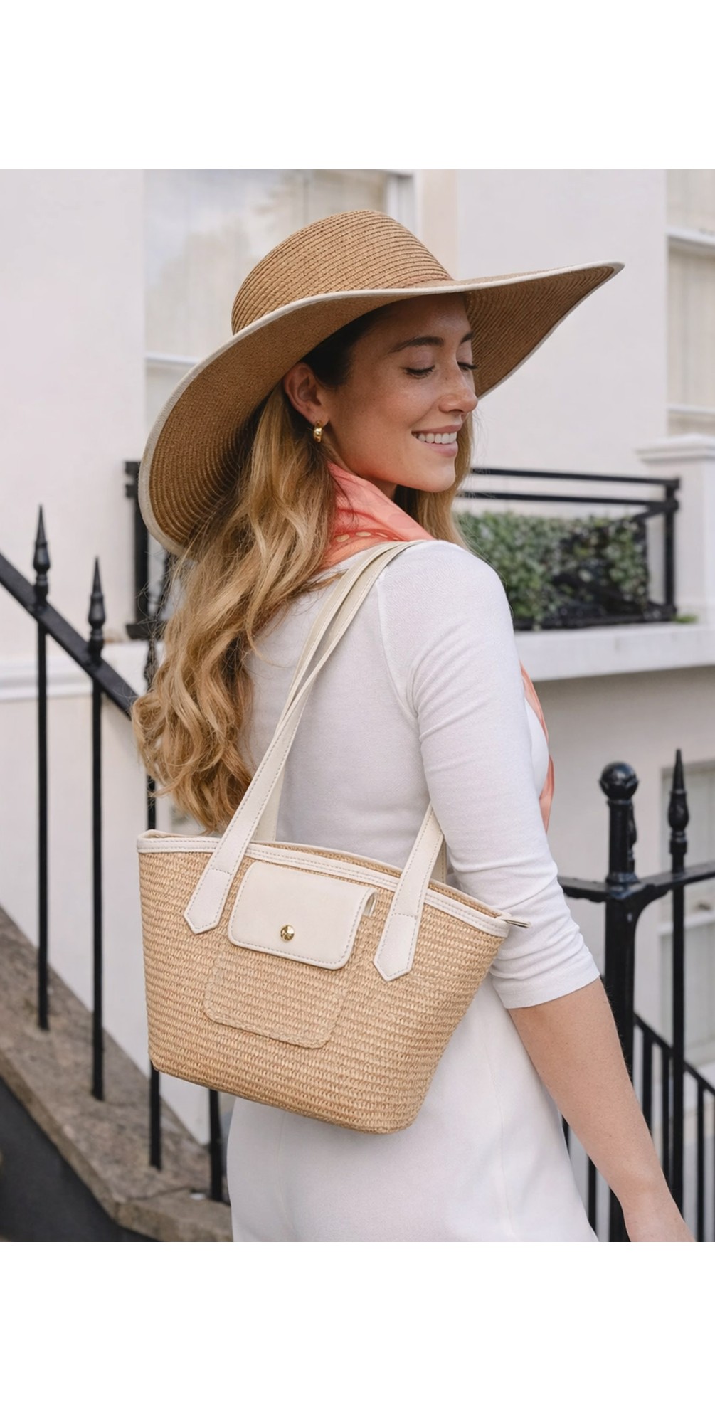 The Barbados Tote combines the relaxed appeal of a woven beach bag with the polished look of a structured shoulder tote. The contrast panel detail adds a refined touch, making it perfect for holidays, shopping trips or brunch dates.