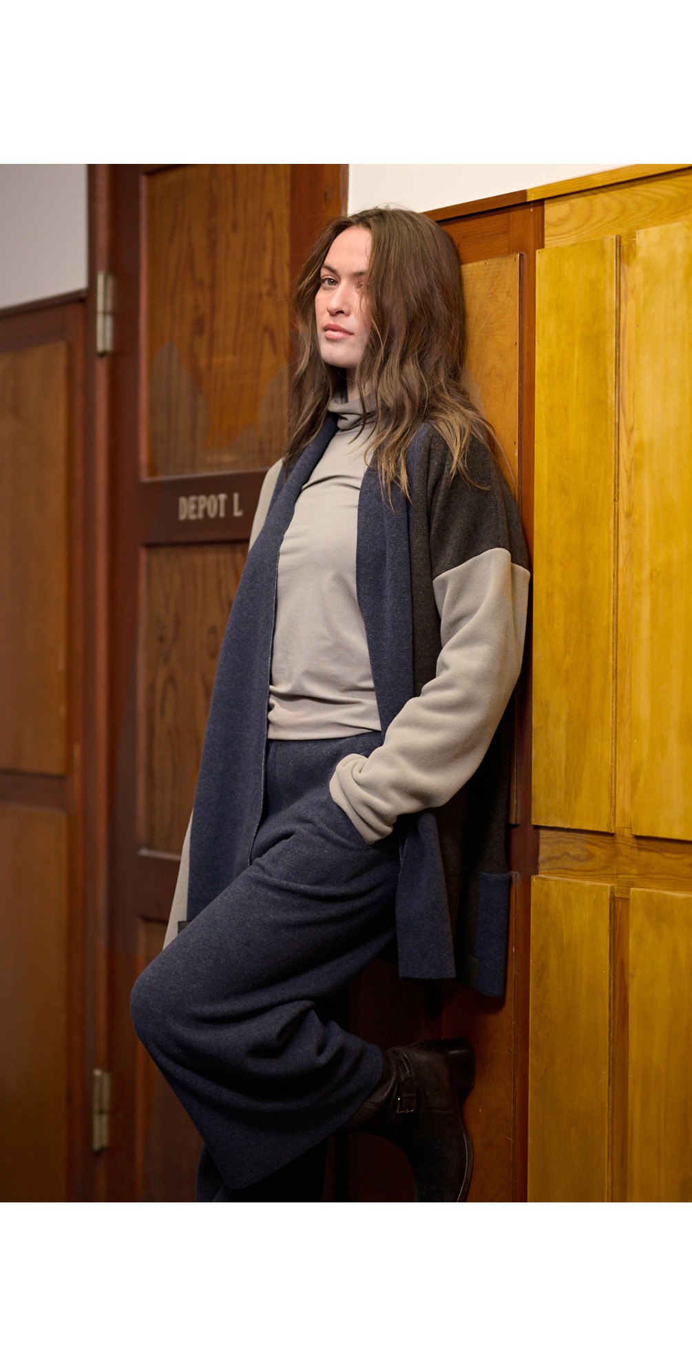 Introducing from Henriette Steffensen,  A patchwork cardigan with a relaxed shape and mid-thigh length, designed to bring both comfort and character to your wardrobe. It features a soft shawl collar, practical pockets, and our signature grosgrain band—a detail that reflects the DNA of Henriette Steffensen Copenhagen.