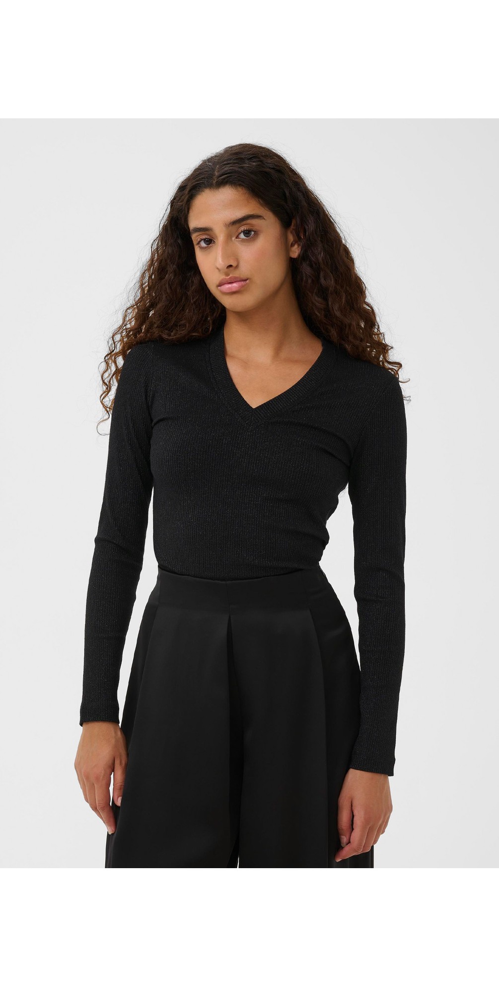 Elevate your everyday style with the Dagna Lurex V-Neck Top from InWear. This long-sleeved ribbed top features a flattering V-neckline and a subtle metallic thread woven throughout, adding a touch of shimmer to a classic silhouette. Perfect for versatile styling, the Dagna top transitions effortlessly from day to night. Pair it with jeans for a relaxed daytime look, tuck it into a skirt for evening elegance, or layer it under a blazer or jacket for polished occasions.