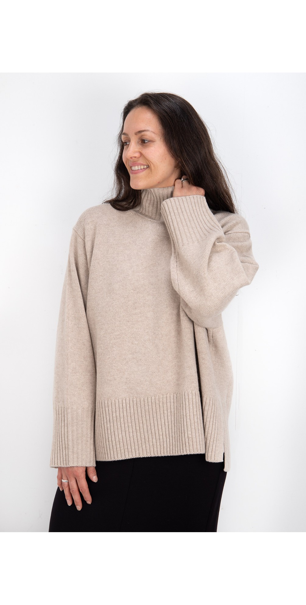 The InWear Geal Kaxy Highneck Knit is a sumptous loose fit design, perfect for cosying up in this Autumn. Available in either n a forest green or smokey beige hue, this Autumnal knit offers a warming funnel neckline and stylish oversized side slits. Wear with jeans and ankle boots this season.