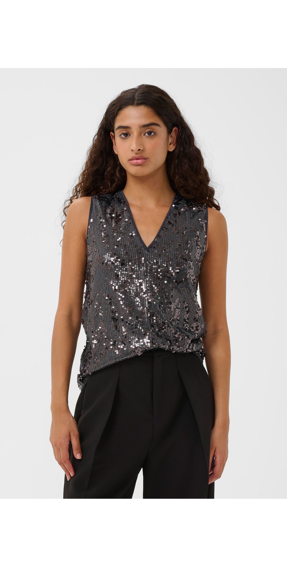 Illuminate your eveningwear with the InWear KIMBA Blouse — a sleeveless sequin top that combines relaxed sophistication and refined sparkle. Designed for women who want to make an impact without compromising on comfort, this blouse features a soft drape and a deep V-neckline, framing the décolletage with understated elegance. The relaxed fit skims gently past the body, making it ideal for pairing with tailored trousers, skirts, or sleek denim. Whether worn solo under a blazer or styled for a night out, this shimmering top lends instant glamour to your look.