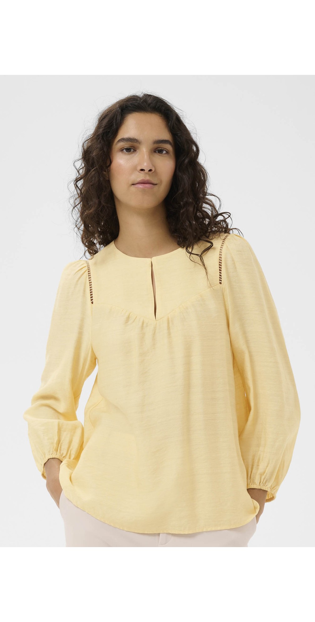 Crafted from lightweight fabric, it drapes gently over the body for a flattering, easy fit. The round neckline and long sleeves with elasticated cuffs create a soft, refined shape, while subtle shoulder detailing adds a delicate touch. Perfect for pairing with tailored trousers or denim, this blouse transitions seamlessly from day to evening.
