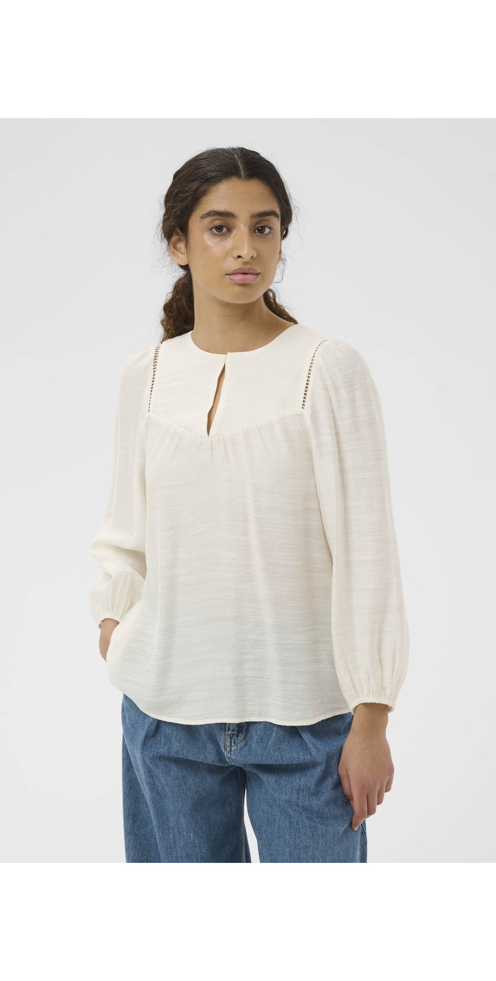 Crafted from lightweight fabric, it drapes gently over the body for a flattering, easy fit. The round neckline and long sleeves with elasticated cuffs create a soft, refined shape, while subtle shoulder detailing adds a delicate touch. Perfect for pairing with tailored trousers or denim, this blouse transitions seamlessly from day to evening.