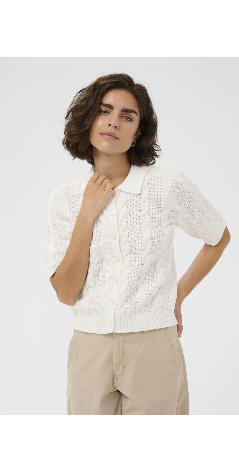 Crafted from a soft cable knit, it offers texture and lightweight warmth for everyday wear. The straight fit creates a clean, flattering shape, while the classic collar and button-up front add a refined touch. Finished with short sleeves and an easy-to-wear design, it’s perfect for layering or styling on its own for effortless, polished looks.