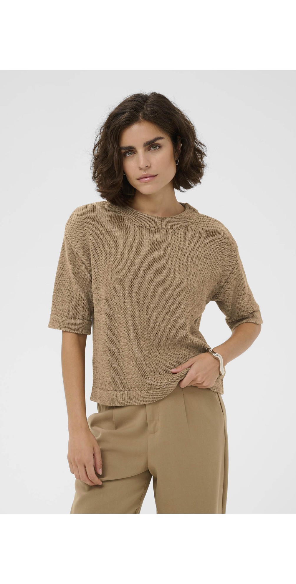 Crafted from a soft, breathable cotton-blend knit, it offers a lightweight feel while maintaining structure and durability. The relaxed fit drapes comfortably over the body, while the classic round neckline and short sleeves create a timeless, easy-to-style shape. Perfect for pairing with trousers, denim, or skirts, this knit is ideal for layering or wearing on its own.