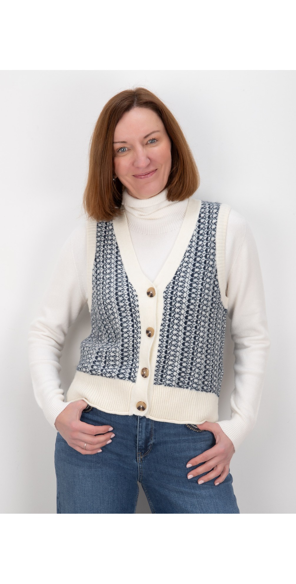 The Gwyneth Fair Isle Sleeveless Cardigan by Lily & Me brings a fresh twist to a heritage classic. With its cropped, boxy silhouette and bold Fair Isle pattern, this button-up knit tank adds a playful pop of colour and texture to your wardrobe. Crafted from a soft blended yarn, it features a flattering V-neckline, solid ribbed trim, and a button placket finished with mock horn buttons for a timeless touch. Style it open over a crisp shirt or buttoned up as a statement layer — perfect with cords or denim for a cosy, modern look.