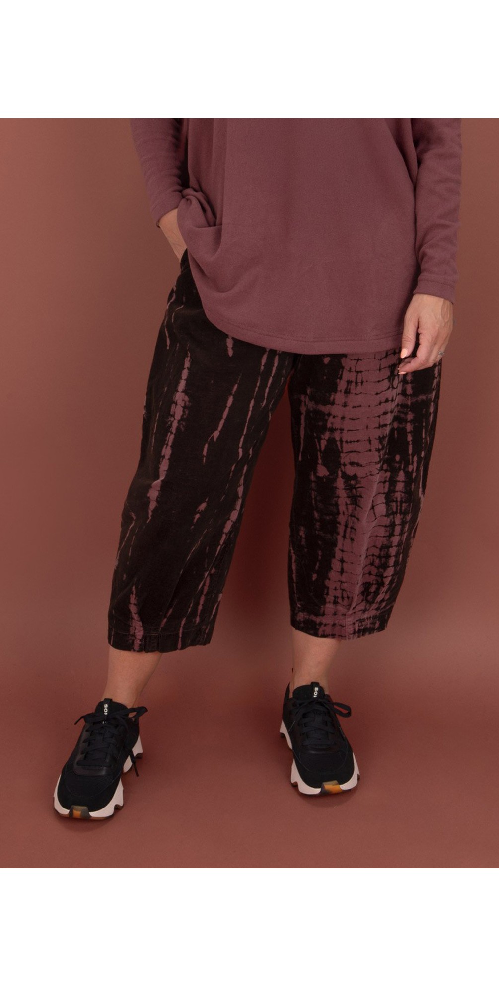 The Bianco PR Cotton Velvet Trouser is a cropped printed trouser in Mama B's signature bubble silhouette with a tapered leg. The trousers feature cuffed hems, side pockets and flattering pleat detailing.