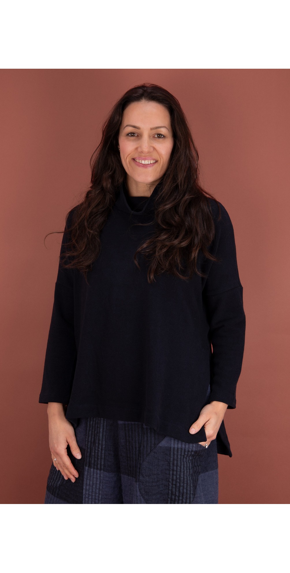 Announcing the Dina Split Sides Jumper from Mama B. A new style for Gemini, featuring a loose roll neck design with side splits and full-length sleeves. Style it with a skirt or trousers for the perfect autumnal look, incorporating style and comfort.
