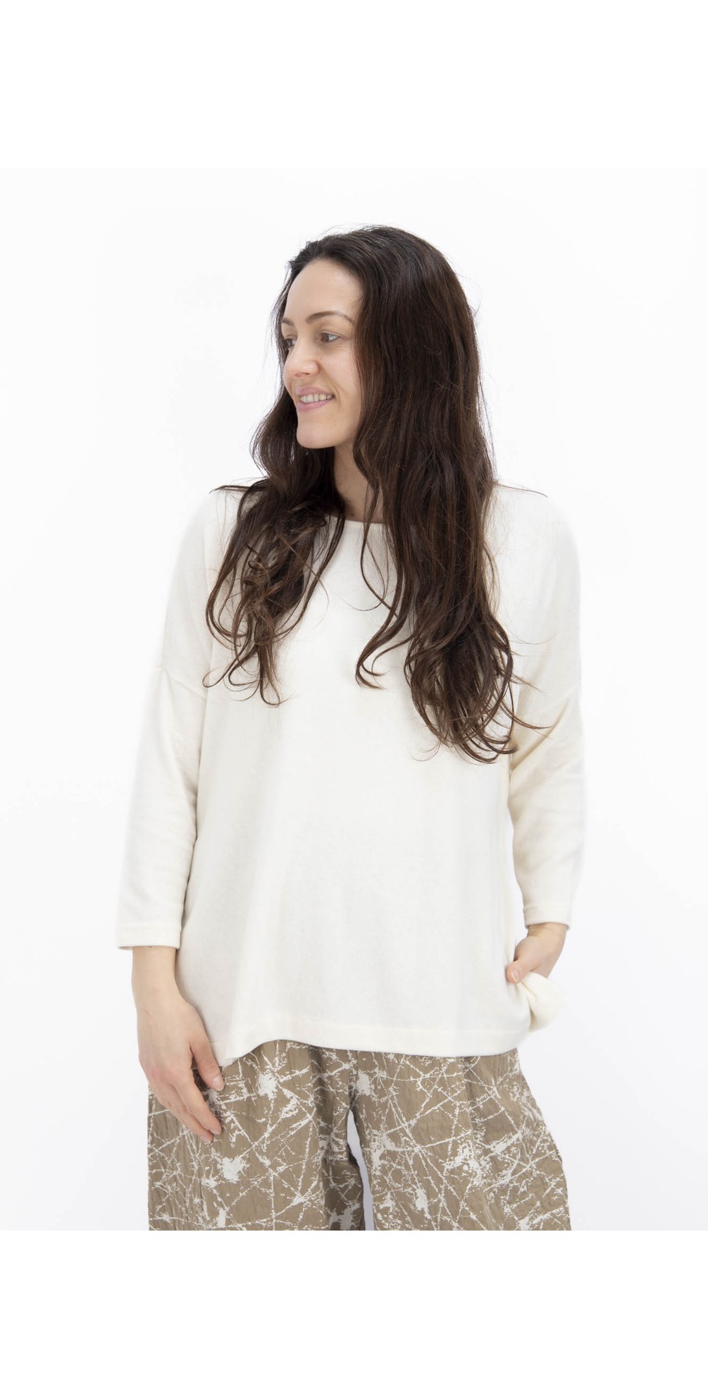 Mama B's Emotiva Oversize Eco Fleece Jumper is designed with a boat neckline, bracelet-length sleeves with dropped shoulder seam and an oversized boxy silhouette that adds to the relaxed aesthetic. Style yours with everything from Mama B's signature Bianco Trouser to wide-leg jeans.