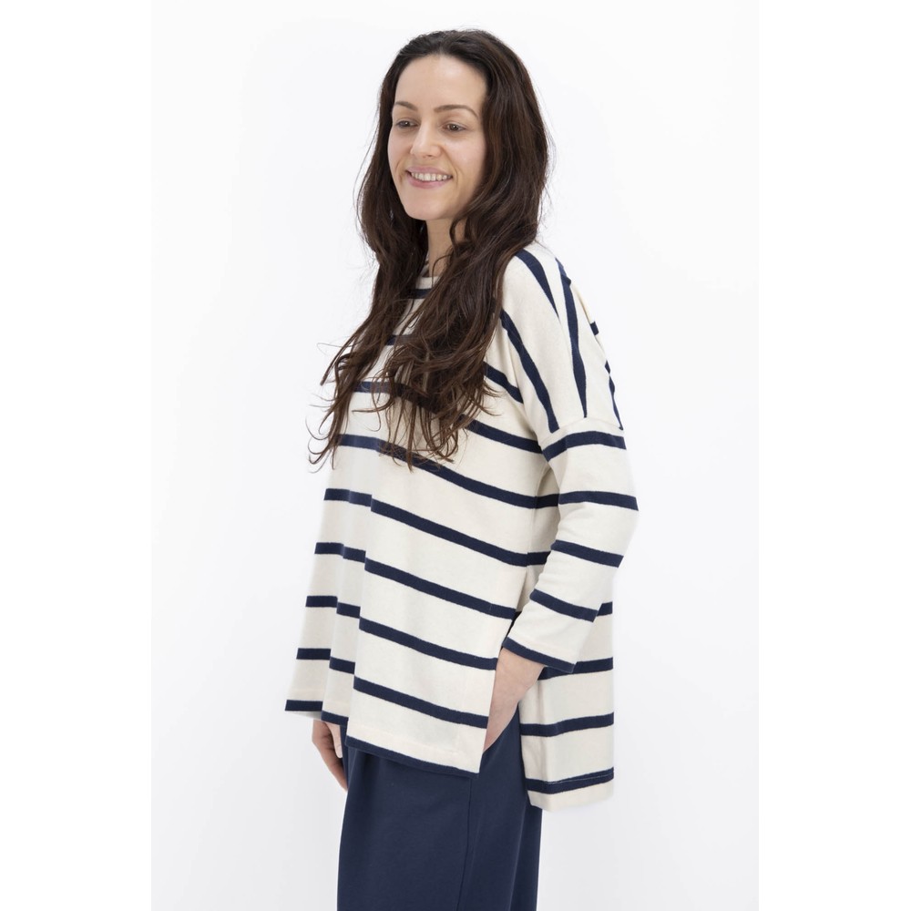 Mama B's Emotiva R Relaxed Stripe Eco Fleece Jumper is designed with a boat neckline, bracelet-length sleeves with dropped shoulder seam and an oversized boxy silhouette that adds to the relaxed aesthetic. Style yours with everything from Mama B's signature Bianco Trouser to wide-leg jeans.