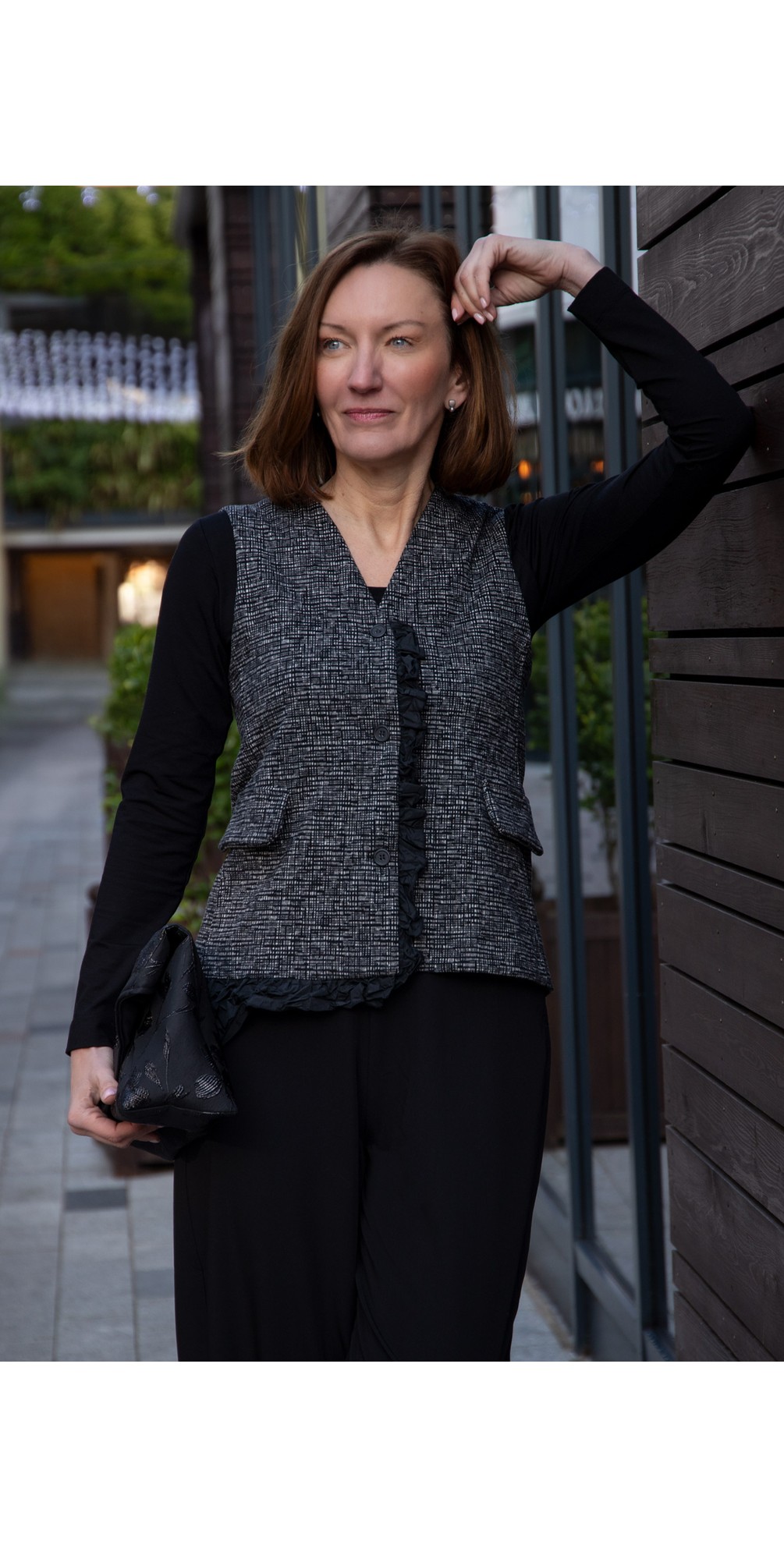 The Gevda JF Jacquard Frill Waistcoat from Mama B is a staple piece in your wardrobe. It features a frill detail, black buttons, and thick material, making it a perfect layering piece throughout the season. Style it alone with the matching skirt or trousers, or layer with the Jacket or long sleeve top from Mama B.